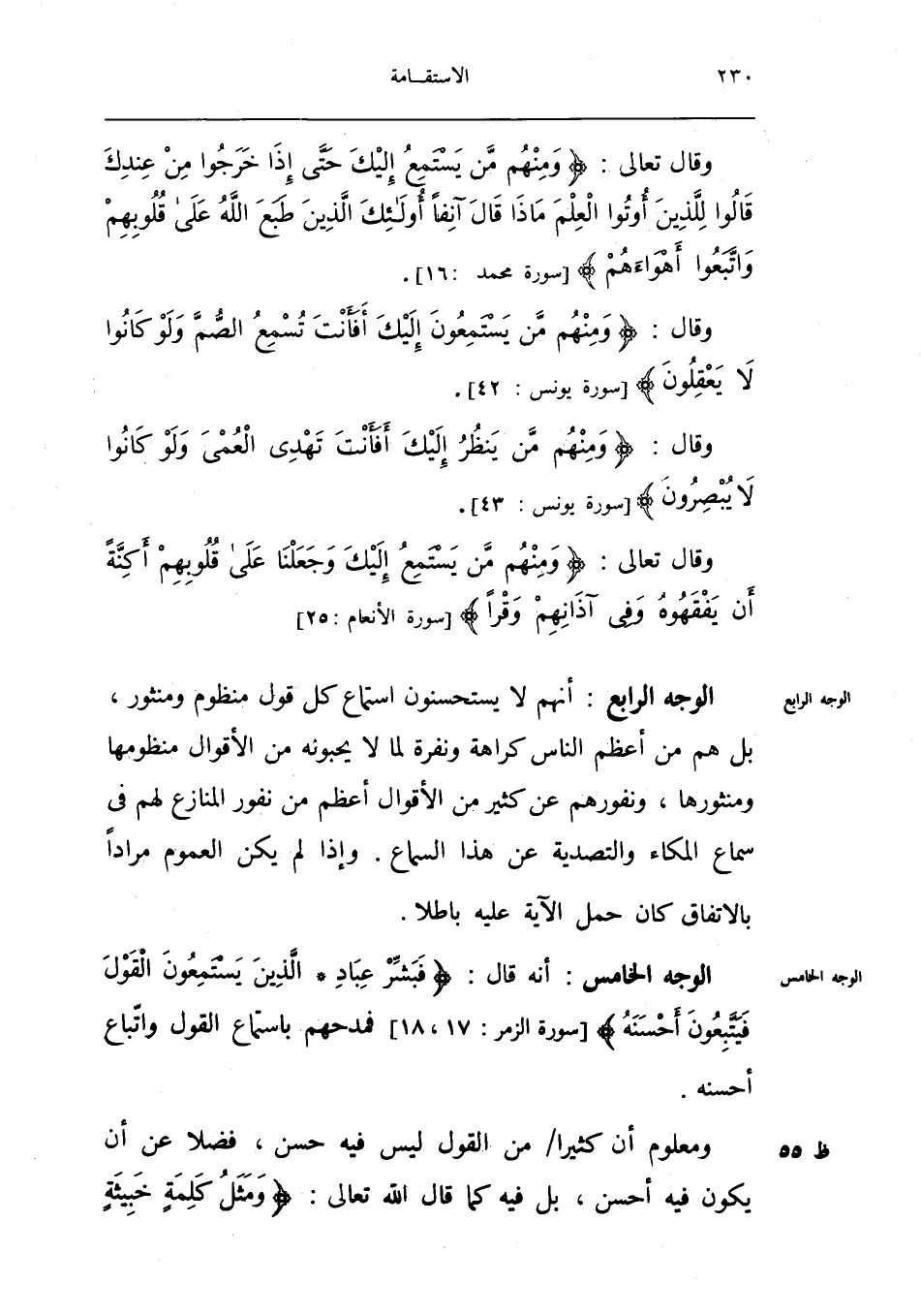 الْوَجْه الرَّابِع أَنهم لَا يستحسنون اسْتِمَاع كل قَول منظوم ومنثور بل هم من أعظم النَّاس كَرَاهَة ونفرة لما لَا يحبونه من الْأَقْوَال منظومها ومنثورها ونفورهم عَن كثير من الْأَقْوَال أعظم من نفور المنازع لَهُم فِي سَماع المكاء والتصدية عَن هَذَا السماع وَإِذا لم يكن الْعُمُوم مرَادا بالِاتِّفَاقِ كَانَ حمل الْآيَة عَلَيْهِ بَاطِلا
