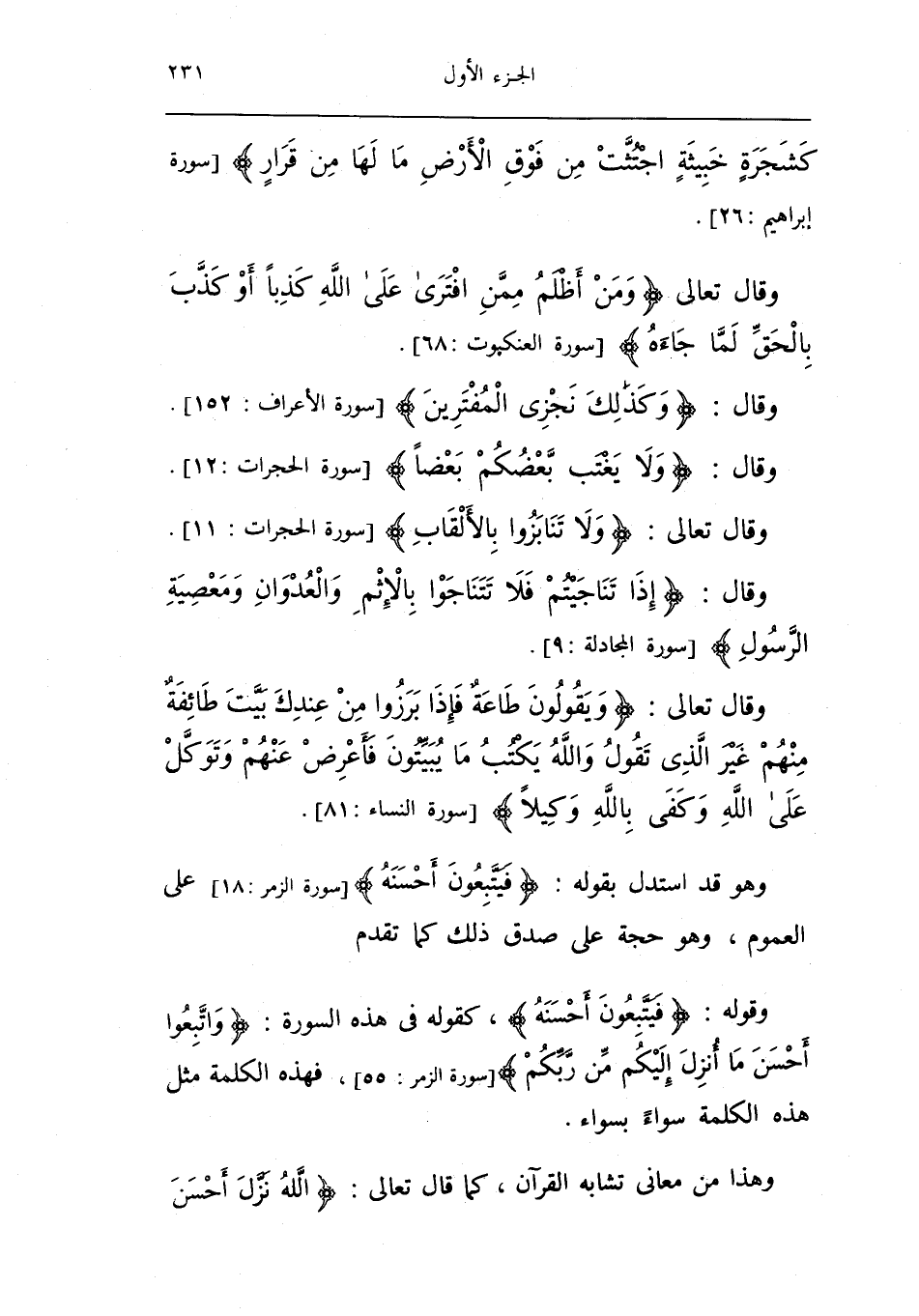 وَهُوَ قد اسْتدلَّ بقوله فيتبعون أحْسنه [سُورَة الزمر 18] على الْعُمُوم وَهُوَ حجَّة على صدق ذَلِك كَمَا تقدم