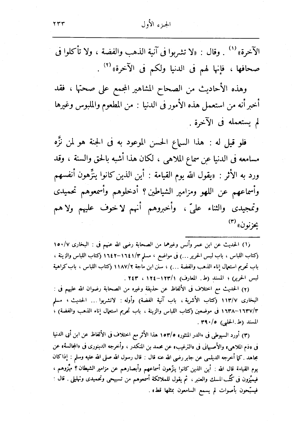فَلَو قيل لَهُ هَذَا السماع الْحسن الْمَوْعُود بِهِ فِي الْجنَّة هُوَ لمن نزه مسامعه فِي الدُّنْيَا عَن سَماع الملاهي لَكَانَ هَذَا أشبه بِالْحَقِّ وَالسّنة وَقد ورد بِهِ الْأَثر يَقُول الله يَوْم الْقِيَامَة أَيْن الَّذين كَانُوا ينزهون أنفسهم وأسماعهم عَن اللَّهْو وَمَزَامِير الشَّيَاطِين أدخلوهم وأسمعوهم تحميدي وتمجيدي وَالثنَاء على وأخبروهم أَنهم لَا خوف عَلَيْهِم ولاهم يَحْزَنُونَ