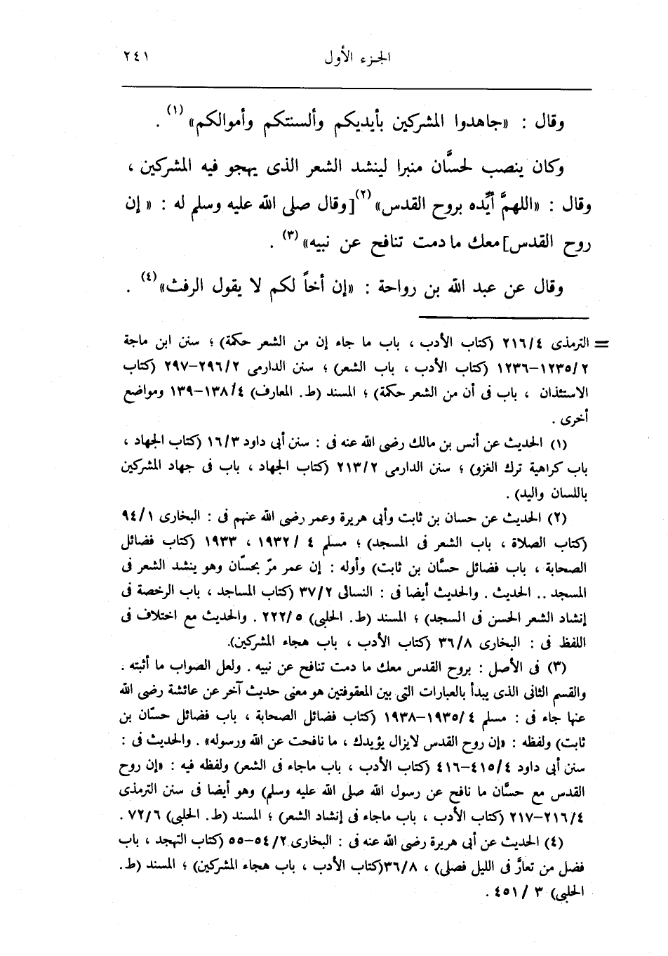 وَكَانَ ينصب لحسان منبرا لينشد الشّعْر الَّذِي يهجو فِيهِ الْمُشْركين وَقَالَ اللَّهُمَّ أيده بِروح الْقُدس وَقَالَ ص لَهُ إِن روح الْقُدس مَعَك مَا دمت تنافح عَن نبيه