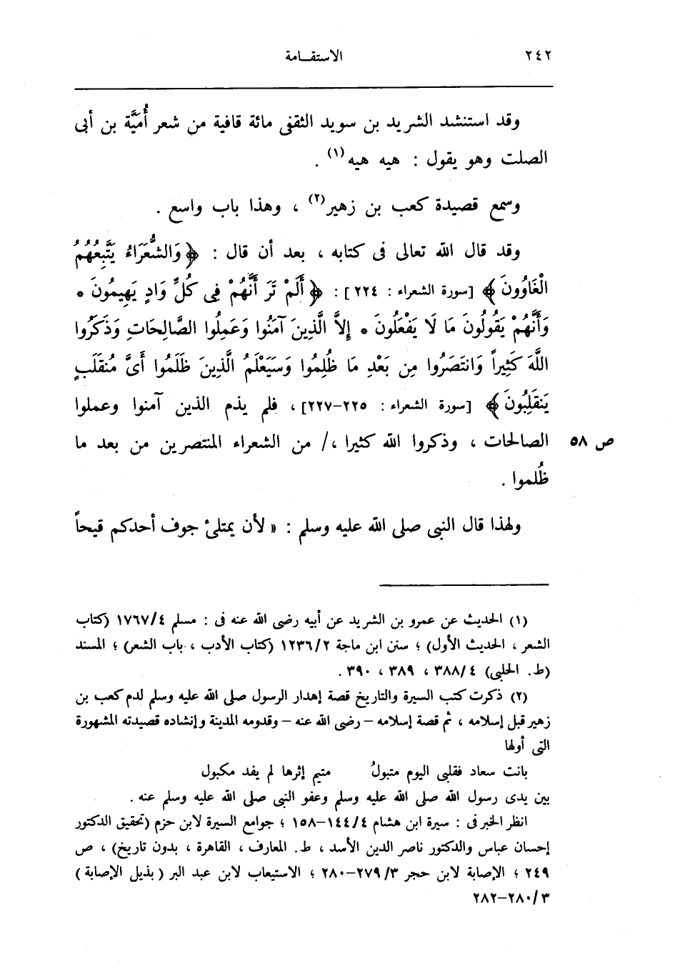 وَقد قَالَ الله تَعَالَى فِي كِتَابه بعد ان قَالَ وَالشعرَاء يتبعهُم الْغَاوُونَ [سُورَة الشُّعَرَاء 224] ألم تَرَ أَنهم فِي كل وَاد يهيمون وَأَنَّهُمْ يَقُولُونَ مَا لَا يَفْعَلُونَ إِلَّا الَّذين آمنُوا وَعمِلُوا الصَّالِحَات وَذكروا الله كثيرا وانتصروا من بعد مَا ظلمُوا وَسَيعْلَمُ الَّذين ظلمُوا أَي مُنْقَلب يَنْقَلِبُون [سُورَة الشُّعَرَاء 225 227] فَلم يذم الَّذين آمنُوا وَعمِلُوا الصَّالِحَات وَذكروا الله كثيرا من الشُّعَرَاء المنتصرين من بعد مَا ظلمُوا