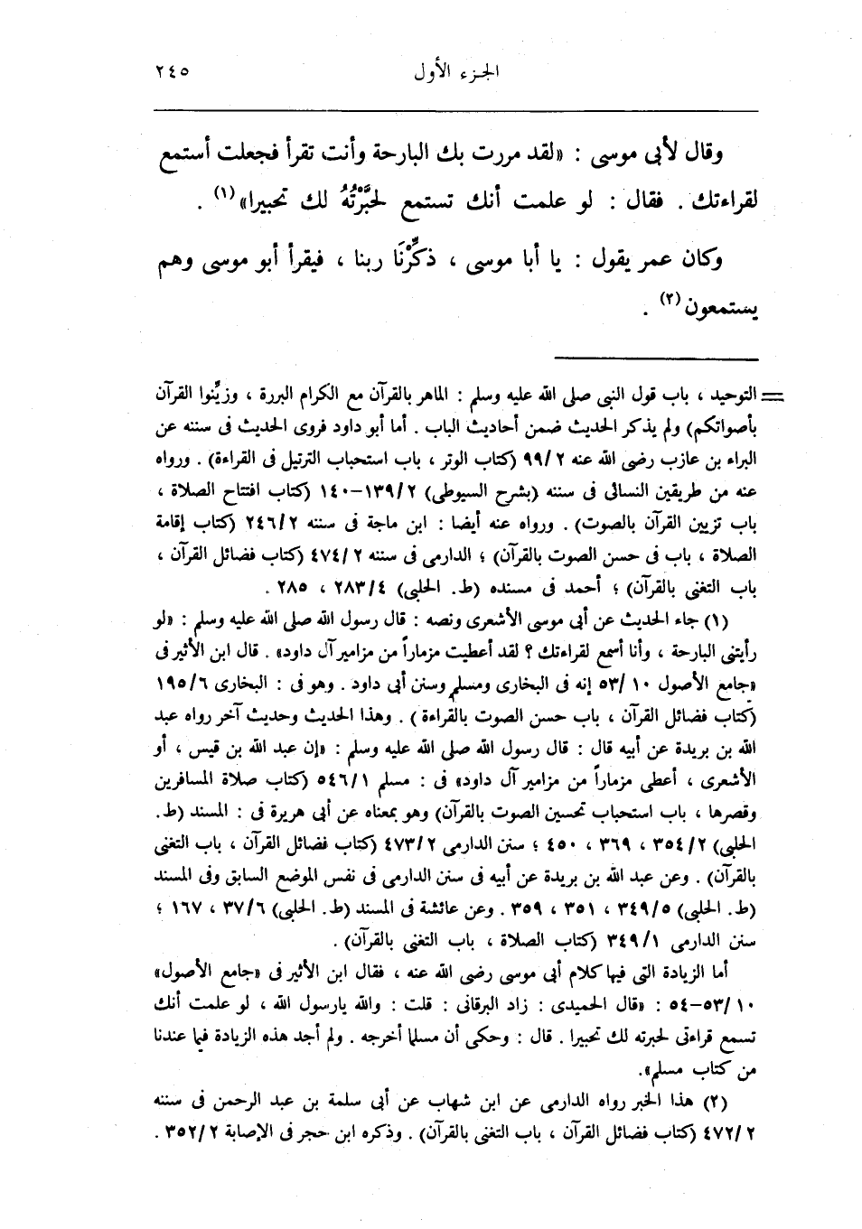 وَقَالَ لأبي مُوسَى لقد مَرَرْت بك البارحة وَأَنت تقْرَأ فَجعلت أستمع لقراءتك فَقَالَ لَو علمت أَنَّك تستمع لحبرته لَك تحبيرا