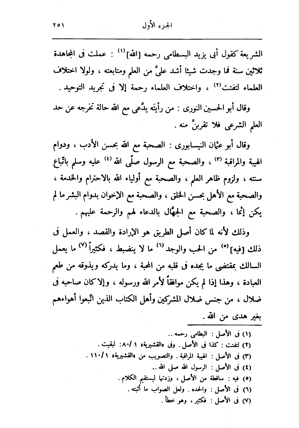 وَذَلِكَ لِأَنَّهُ لما كَانَ أصل الطَّرِيق هُوَ الْإِرَادَة وَالْقَصْد وَالْعَمَل فِي ذَلِك فِيهِ من الْحبّ والوجد مَا لَا يَنْضَبِط فكثير مَا يعْمل السالك بِمُقْتَضى مَا يجده فِي قلبه من الْمحبَّة وَمَا يُدْرِكهُ ويذوقه من طعم الْعِبَادَة وَهَذَا إِذا لم يكن مُوَافقا لأمر الله وَرَسُوله وَإِلَّا كَانَ صَاحبه فِي ضلال من جنس ضلال الْمُشْركين وَأهل الْكتاب الَّذين اتبعُوا أهوائهم بِغَيْر هدى من الله
