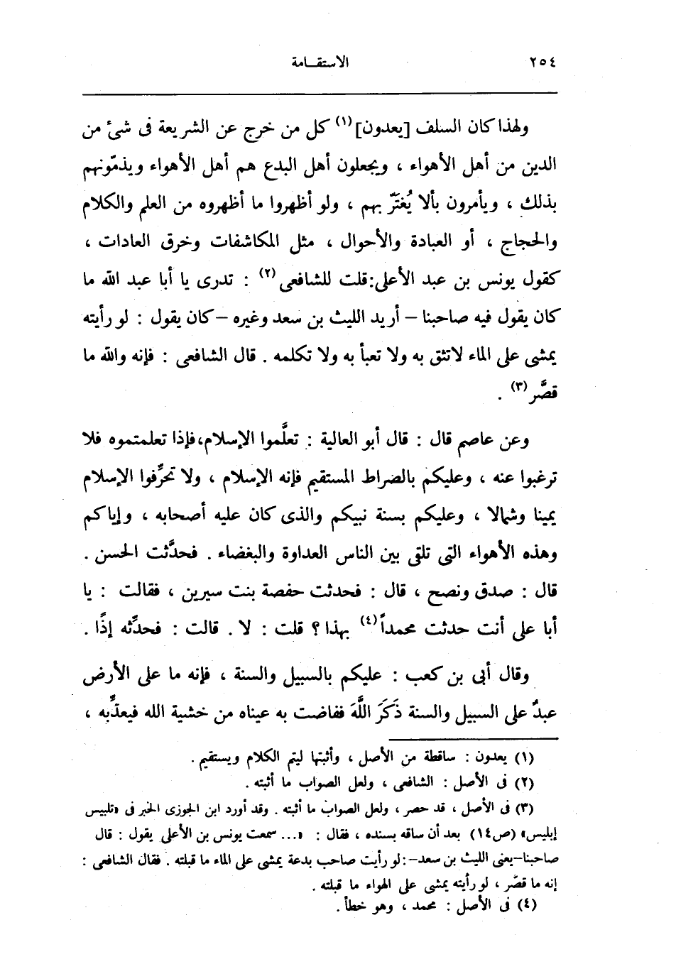 وَعَن عَاصِم قَالَ قَالَ أَبُو الْعَالِيَة تعلمُوا الْإِسْلَام فَإِذا تعلمتموه فَلَا ترغبوا عَنهُ وَعَلَيْكُم بالصراط الْمُسْتَقيم فَإِنَّهُ الْإِسْلَام وَلَا تحرفوا الْإِسْلَام يَمِينا وَشمَالًا وَعَلَيْكُم بِسنة نَبِيكُم وَالَّذِي كَانَ عَلَيْهِ أَصْحَابه وَإِيَّاكُم وَهَذِه الْأَهْوَاء الَّتِي تلقى بَين النَّاس الْعَدَاوَة والبغضاء فَحدثت الْحسن قَالَ صدق ونصح قَالَ فَحدثت حَفْصَة بنت سِيرِين فَقَالَت أَبَا عَليّ أَنْت حدثت مُحَمَّدًا بِهَذَا قلت لَا قَالَت فحدثه إِذا