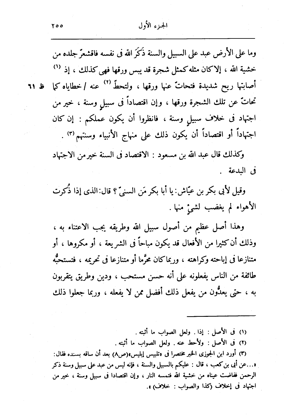 وَمَا على الأَرْض عبد على السَّبِيل وَالسّنة ذكر الله فِي نَفسه فأقشعر جلده من خشيَة الله إِلَّا كَانَ مثله كَمثل شَجَرَة قد يبس وَرقهَا فهى كَذَلِك إِذْ أصابتها ريح شَدِيدَة فتحات عَنْهَا وَرقهَا ولتحط عَنهُ خطاياه كَمَا تحات عَن تِلْكَ الشَّجَرَة وَرقهَا وَإِن اقتصادا فِي سَبِيل وَسنة خير من اجْتِهَاد فِي خلاف سَبِيل وَسنة فانظروا أَن يكون عَمَلكُمْ إِن كَانَ اجْتِهَادًا أَو اقتصادا أَن يكون على منهاج الْأَنْبِيَاء وسنتهم