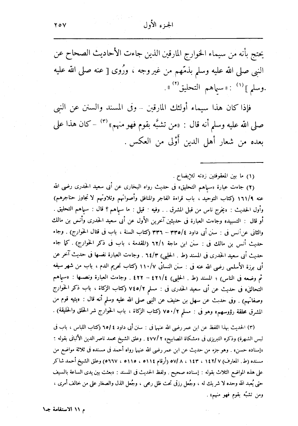 فَإِذا كَانَ هَذَا سيماء أُولَئِكَ المارقين وَفِي الْمسند وَالسّنَن عَن النَّبِي صلى الله عَلَيْهِ وَسلم أَنه قَالَ من تشبه بِقوم فَهُوَ مِنْهُم كَانَ هَذَا على بعده من شعار أهل الدّين أولى من الْعَكْس
