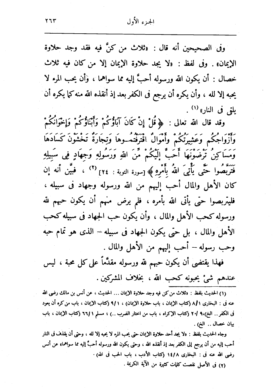 وَفِي الصَّحِيحَيْنِ أَنه قَالَ ثَلَاث من كن فِيهِ فقد وجد حلاوة الْإِيمَان وَفِي لفظ لَا يجد حلاوة الْإِيمَان إِلَّا من كَانَ فِيهِ ثَلَاث خِصَال أَن يكون الله وَرَسُوله أحب إِلَيْهِ مِمَّا سواهُمَا وَأَن يحب الْمَرْء لَا يُحِبهُ إِلَّا لله وَأَن يكره أَن يرجع فِي الْكفْر بعد إِذْ أنقذه الله مِنْهُ كَمَا يكره أَن يلقى فِي النَّار