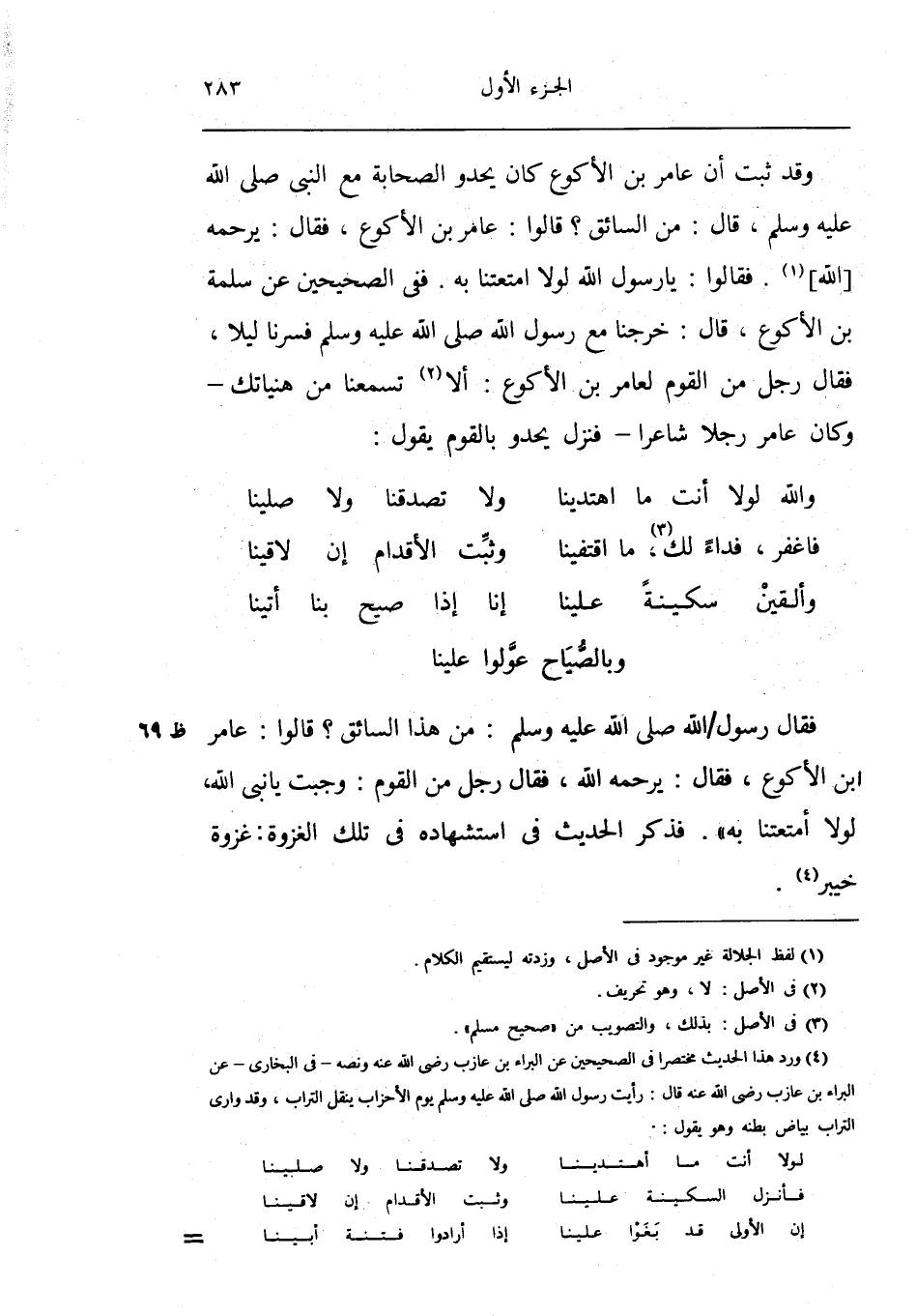 وَقد ثَبت أَن عَامر بن الْأَكْوَع كَانَ يَحْدُو الصَّحَابَة مَعَ النَّبِي صلى الله عَلَيْهِ وَسلم قَالَ من السَّائِق قَالُوا عَامر بن الاكوع فَقَالَ يرحمه الله فَقَالُوا يَا رَسُول الله لَوْلَا امتعتنا بِهِ فَفِي الصَّحِيحَيْنِ عَن سَلمَة بن الْأَكْوَع قَالَ خرجنَا مَعَ رَسُول الله صلى الله عَلَيْهِ وَسلم فسرنا لَيْلًا فَقَالَ رجل من الْقَوْم لعامر بن الْأَكْوَع أَلا تسمعنا من هنياتك وَكَانَ عَامر رجلا شَاعِرًا فَنزل يَحْدُو بالقوم يَقُول ... وَالله لَوْلَا أَنْت مَا اهتدينا وَلَا تصدقنا وَلَا صلينَا
