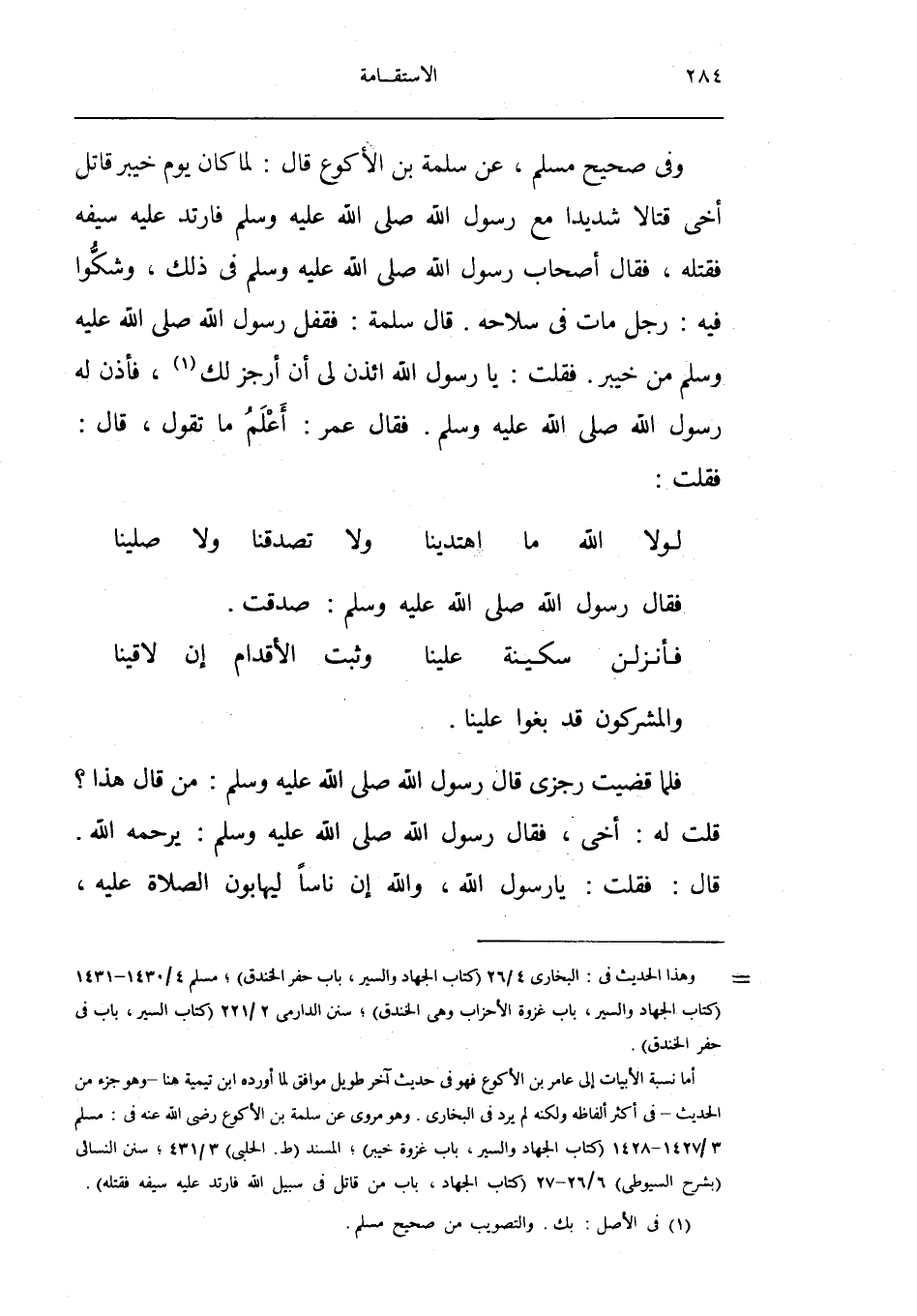 وَفِي صَحِيح مُسلم عَن سَلمَة بن الاكوع قَالَ لما كَانَ يَوْم خَيْبَر قَاتل أخي قتالا شَدِيدا مَعَ رَسُول الله صلى الله عَلَيْهِ وَسلم فَارْتَد عَلَيْهِ سَيْفه فَقتله فَقَالَ أَصْحَاب رَسُول الله صلى الله عَلَيْهِ وَسلم فِي ذَلِك وَشَكوا فِيهِ رجل مَاتَ فِي سلاحه قَالَ سَلمَة فقفل رَسُول الله صلى الله عَلَيْهِ وَسلم من خَبِير فَقلت يَا رَسُول الله أئذن لي أَن ارجز لَك فَأذن لَهُ رَسُول الله صلى الله عَلَيْهِ وَسلم فَقَالَ عمر أعلم مَا تَقول قَالَ فَقلت ... لَوْلَا الله مَا اهتدينا وَلَا تصدقنا وَلَا صلينَا ...
