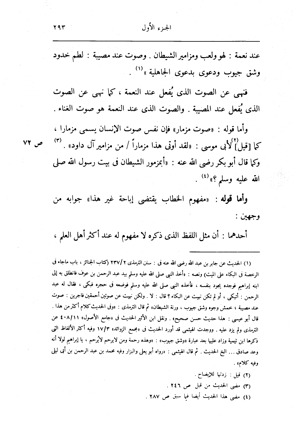 فَنهى عَن الصَّوْت الَّذِي يفعل عِنْد النِّعْمَة كَمَا نهى عَن الصَّوْت الَّذِي يفعل عِنْد الْمُصِيبَة وَالصَّوْت الَّذِي عِنْد النِّعْمَة هُوَ صَوت الْغناء