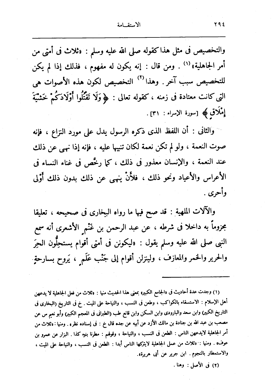 والألات الملهية قد صَحَّ فِيهَا مَا رَوَاهُ البُخَارِيّ فِي صَحِيحه تَعْلِيقا مَجْزُومًا بِهِ دَاخِلا فِي شَرطه عَن عبد الرَّحْمَن بن غنم الْأَشْعَرِيّ أَنه سمع النَّبِي صلى الله عَلَيْهِ وَسلم يَقُول لَيَكُونن فِي أمتِي أَقوام يسْتَحلُّونَ الْحر وَالْحَرِير وَالْخمر وَالْمَعَازِف ولينزلن أَقوام إِلَى جنب علم يروح بسارحة