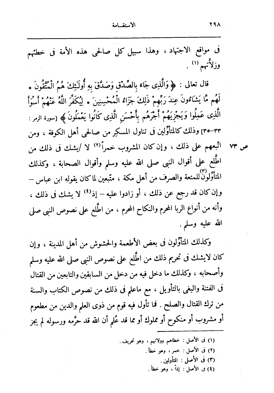 قَالَ تَعَالَى {وَالَّذِي جَاءَ بِالصّدقِ وَصدق بِهِ أُولَئِكَ هم المتقون لَهُم مَا يشاؤون عِنْد رَبهم ذَلِك جَزَاء الْمُحْسِنِينَ ليكفر الله عَنْهُم أَسْوَأ الَّذِي عمِلُوا ويجزيهم أجرهم بِأَحْسَن الَّذِي كَانُوا يعْملُونَ} [سُورَة الزمر 33 35] وَذَلِكَ كالمتأولين فِي تنَاول الْمُسكر من صالحي أهل الْكُوفَة وَمن اتبعهم على ذَلِك وَإِن كَانَ المشروب خمرًا لَا يشك فِي ذَلِك من اطلع على اقوال النَّبِي صلى الله عَلَيْهِ وَسلم وأقوال الصَّحَابَة وَكَذَلِكَ المتأولون للمتعة وَالصرْف من اهل مَكَّة متبعين لما كَانَ يَقُوله ابْن عَبَّاس وَإِن كَانَ قد رَجَعَ عَن ذَلِك أَو زادوا عَلَيْهِ إِذْ لَا يشك فِي ذَلِك وَأَنه من أَنْوَاع الرِّبَا الْمحرم وَالنِّكَاح الْمحرم من اطلع على نُصُوص النَّبِي صلى الله عَلَيْهِ وَسلم