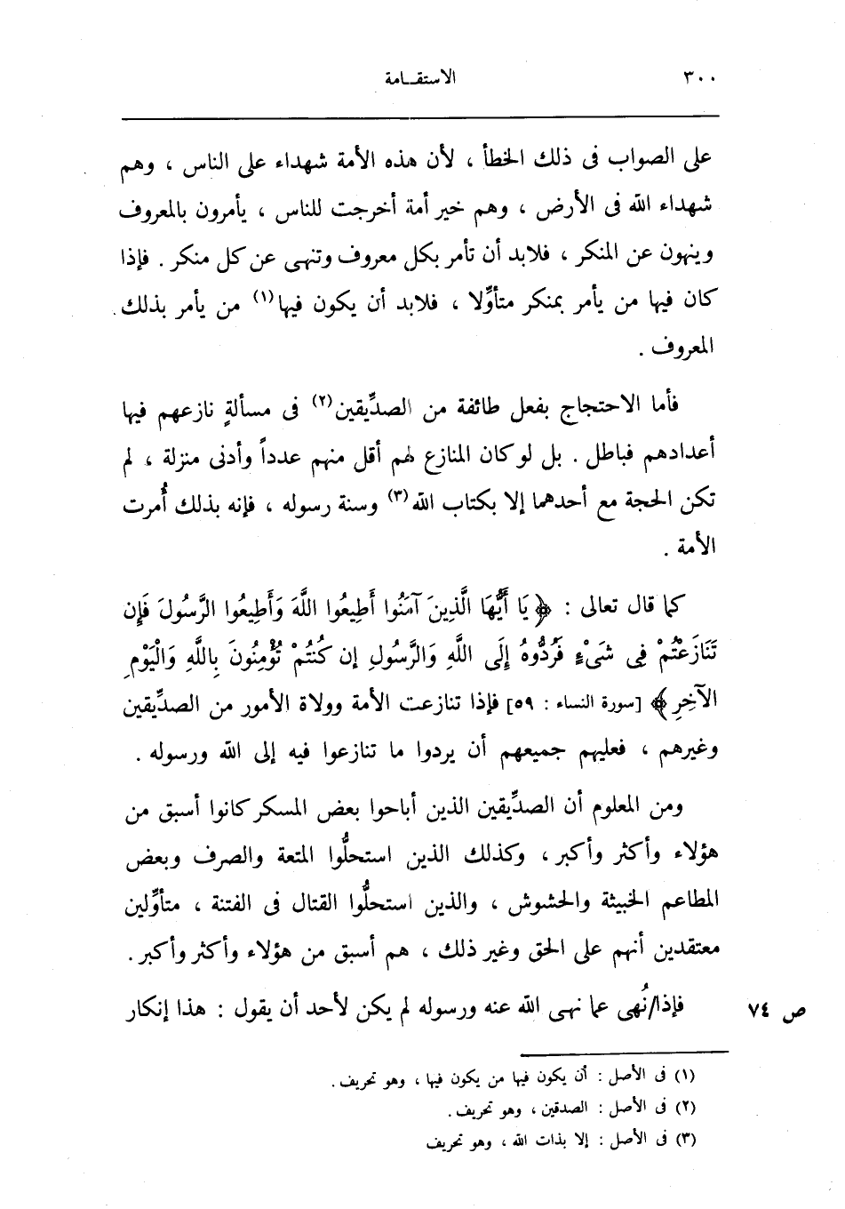 فَأَما الِاحْتِجَاج بِفعل طَائِفَة من الصديقين فِي مَسْأَلَة نازعهم فِيهَا أعدائهم فَبَاطِل بل لَو كَانَ المنازع لَهُم أقل مِنْهُم عددا وَأدنى منزلَة لم تكن الْحجَّة مَعَ أَحدهمَا إِلَّا بِكِتَاب الله وَسنة رَسُوله فَإِنَّهُ بذلك أمرت الامة
