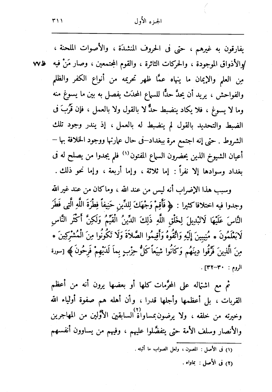 ثمَّ مَعَ اشتماله على الْمُحرمَات كلهَا أَو بَعْضهَا يرَوْنَ أَنه من أعظم القربات بل أعظمها وأجلها قدرا وَأَن أَهله هم الصفوة أَوْلِيَاء الله وَخيرته من خلقه وَلَا يرضون بمساواة السَّابِقين الْأَوَّلين من الْمُهَاجِرين والانصار وَسلف الْأمة حَتَّى يتفضلوا عَلَيْهِم وَفِيهِمْ من يساوون أنفسهم