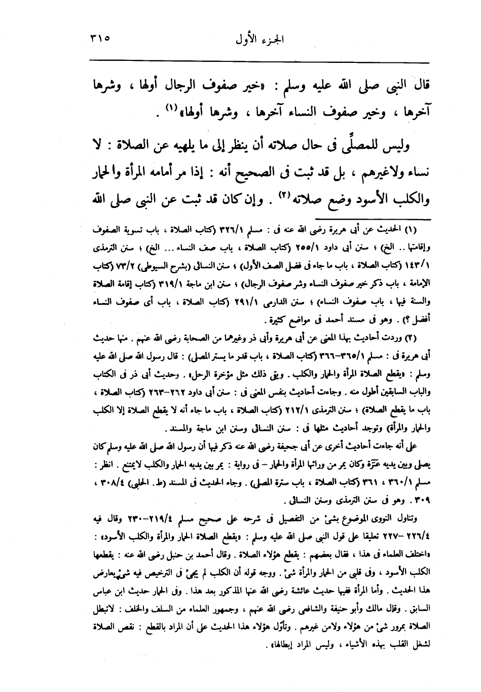 وَلَيْسَ للمصلى فِي حَال صلَاته أَن ينظر إِلَى مَا يلهيه عَن الصَّلَاة لَا نسَاء وَلَا غَيرهم بل قد ثَبت فِي الصَّحِيح أَنه إِذا مر أَمَامه الْمَرْأَة وَالْحمار وَالْكَلب الْأسود وضع صلَاته وَإِن كَانَ قد ثَبت عَن النَّبِي ص