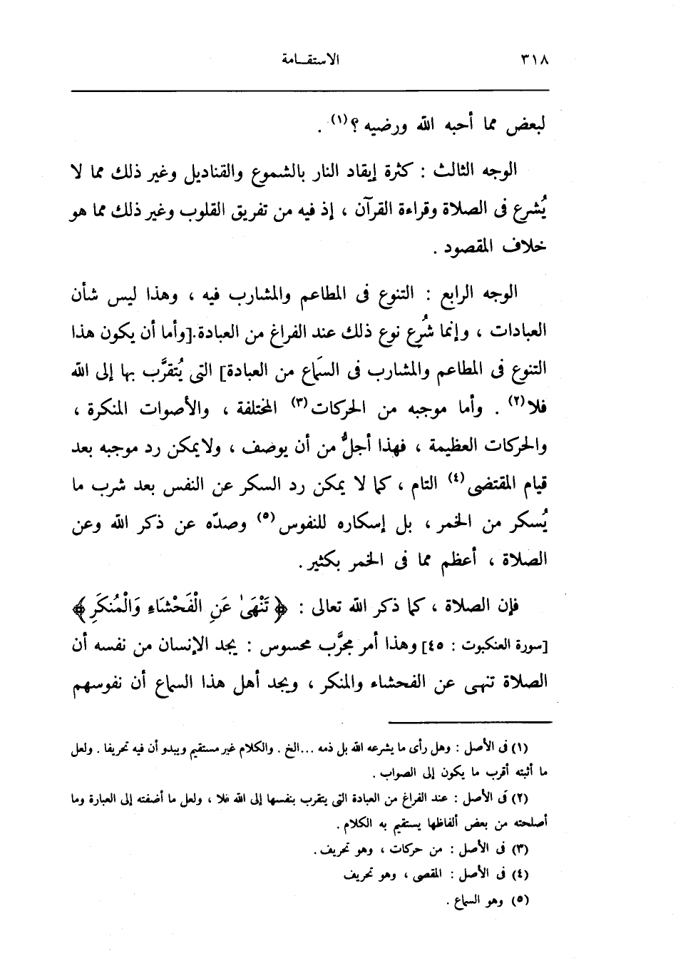 الْوَجْه الرَّابِع التنوع فِي المطاعم والمشارب فِيهِ وَلَيْسَ شَأْن الْعِبَادَات وَإِنَّمَا شرع نوع ذَلِك عِنْد الْفَرَاغ من الْعِبَادَة وَأما أَن يكون هَذَا التنوع فِي المطاعم والمشارب فِي السماع من الْعِبَادَة الَّتِي يتَقرَّب بهَا الى الله فَلَا وَأما مُوجبه من الحركات الْمُخْتَلفَة والأصوات الْمُنكرَة والحركات الْعَظِيمَة فَهَذَا أجل من ان يُوصف وَلَا يُمكن رد مُوجبه بعد قيام الْمُقْتَضى التَّام كَمَا لَا يُمكن رد السكر عَن النَّفس بعد شرب مَا يسكر من الْخمر بل إسكاره للنفوس وصده عَن ذكر الله وَعَن الصَّلَاة أعظم مِمَّا فِي الْخمر بِكَثِير