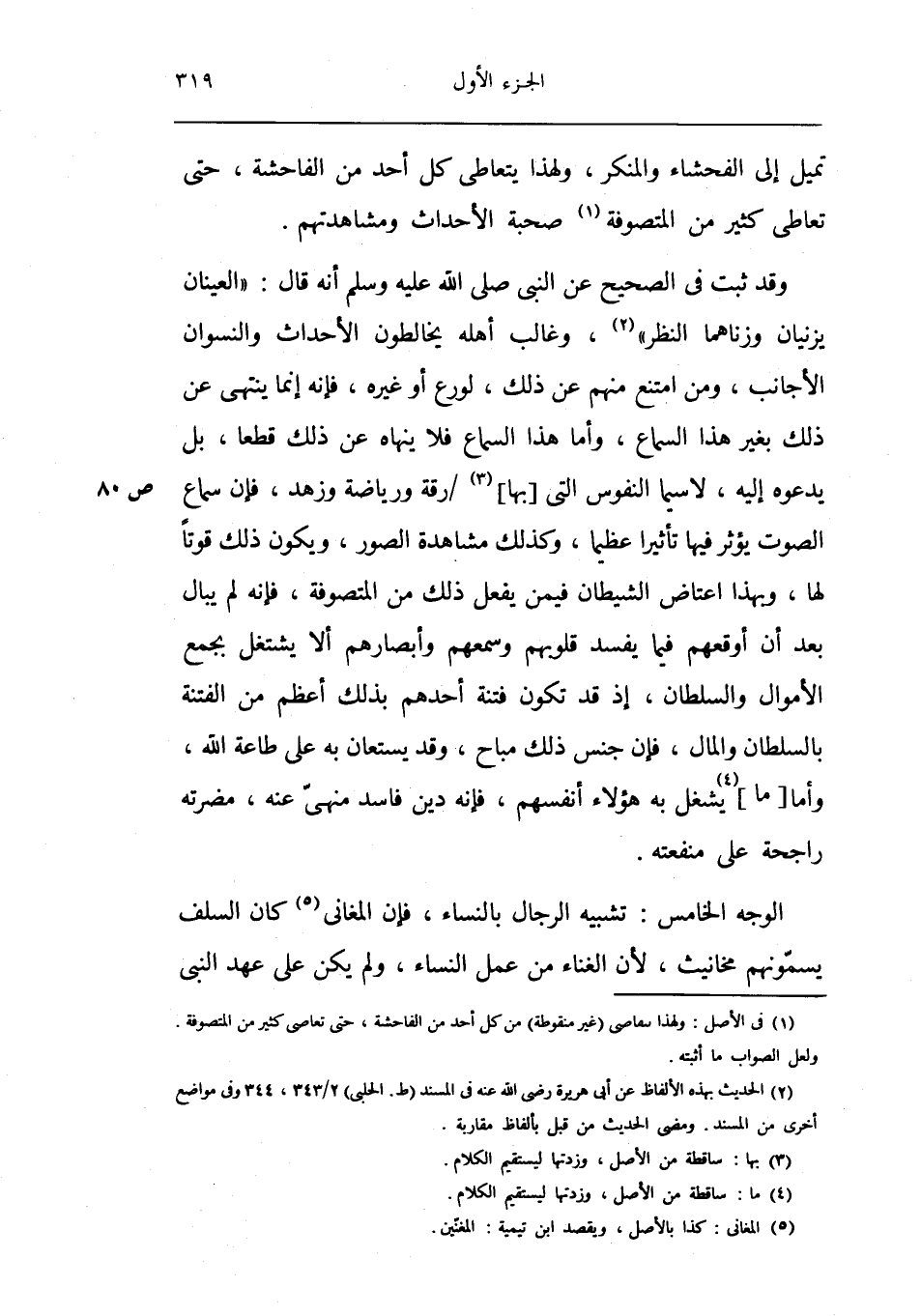 وَقد ثَبت فِي الصَّحِيح عَن النَّبِي صلى الله عَلَيْهِ وَسلم أَنه قَالَ العينان يزينان وزناهما النّظر وغالب أَهله يخالطون الْأَحْدَاث والنسوان الْأَجَانِب وَمن امْتنع مِنْهُم عَن ذَلِك لورع أَو غَيره فَإِنَّهُ إِنَّمَا يَنْتَهِي عَن ذَلِك بِغَيْر هَذَا السماع وَأما هَذَا السماع فال ينهاه عَن ذَلِك قطعا بل يَدعُوهُ إِلَيْهِ لَا سِيمَا النُّفُوس الَّتِي بهَا رقة ورياضة وزهد فَإِن سَماع الصَّوْت يُؤثر فِيهَا تَأْثِيرا عَظِيما وَكَذَلِكَ مُشَاهدَة الصُّور وَيكون ذَلِك قوتا لَهَا وَبِهَذَا اعتاض الشَّيْطَان فِيمَن يفعل ذَلِك من المتصوفة فَإِنَّهُ لم يبال بعد أَن أوقعهم فِيمَا يفْسد قُلُوبهم وسمعهم وأبصارهم أَلا يشْتَغل بِجمع الْأَمْوَال وَالسُّلْطَان اذا قد تكون فتْنَة أحدهم بذلك اعظم من الفتنه بالسلطان وَالْمَال فَإِن جنس ذَلِك مُبَاح وَقد يستعان بِهِ على طَاعَة الله وَأما مَا يشغل بِهِ هَؤُلَاءِ أنفسهم فَإِنَّهُ دين فَاسد منهى عَنهُ مضرته راجحة على منفعَته