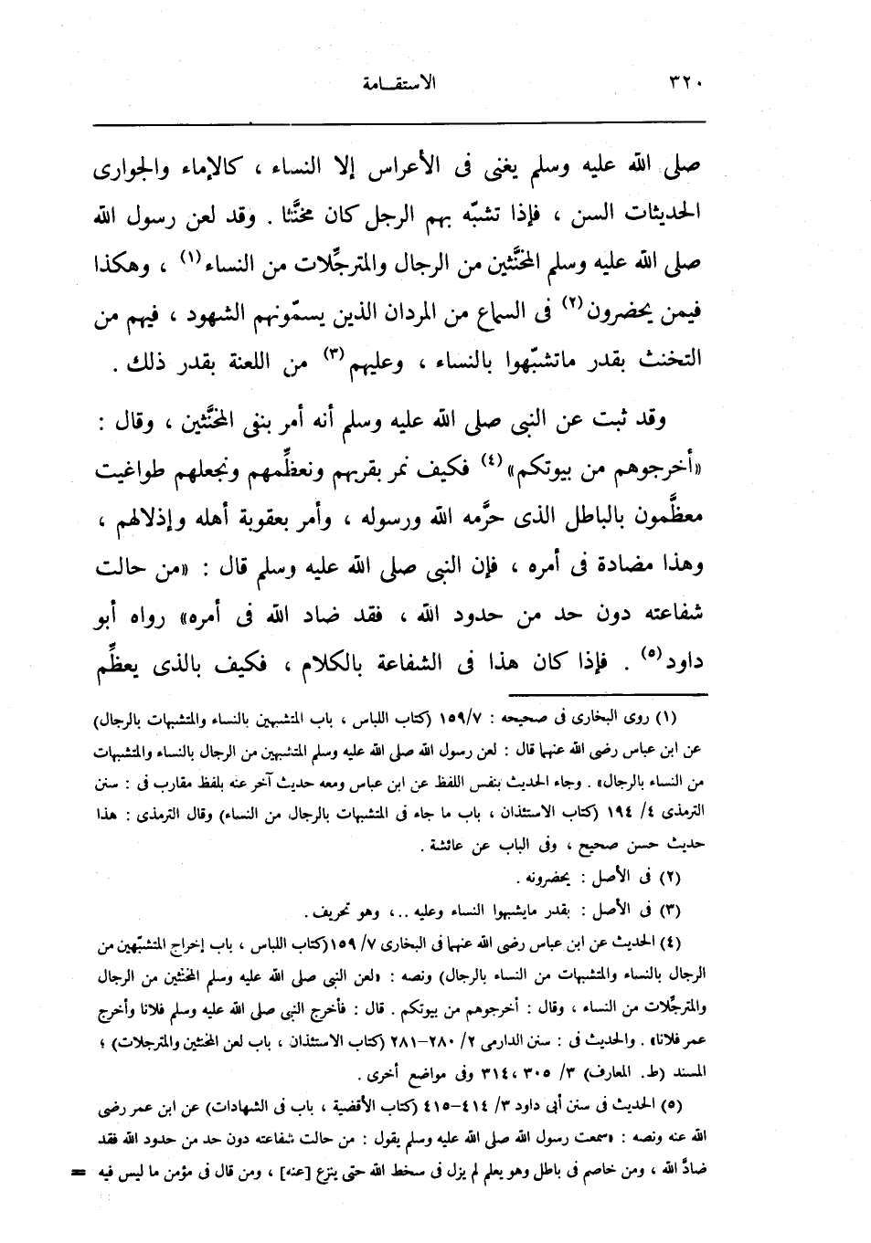 وَقد ثَبت عَن النَّبِي صلى الله عَلَيْهِ وَسلم أَنه أَمر بِنَفْي المخنثين وَقَالَ أخرجوهم من بُيُوتكُمْ فَكيف نمر بقربهم ونعظمهم ونجعلهم طواغيت معظمون بِالْبَاطِلِ الَّذِي حرمه الله وَرَسُوله وَأمر بعقوبة أَهله وإذلالهم وَهَذَا مضاد فِي أمره فَإِن النَّبِي صلى الله عَلَيْهِ وَسلم قَالَ من حَالَتْ شَفَاعَته دون حد من حُدُود الله فقد ضاد الله فِي أمره رَوَاهُ أَبُو دَاوُد فَإِذا كَانَ هَذَا فِي الشَّفَاعَة بالْكلَام فَكيف بِالَّذِي يعظم