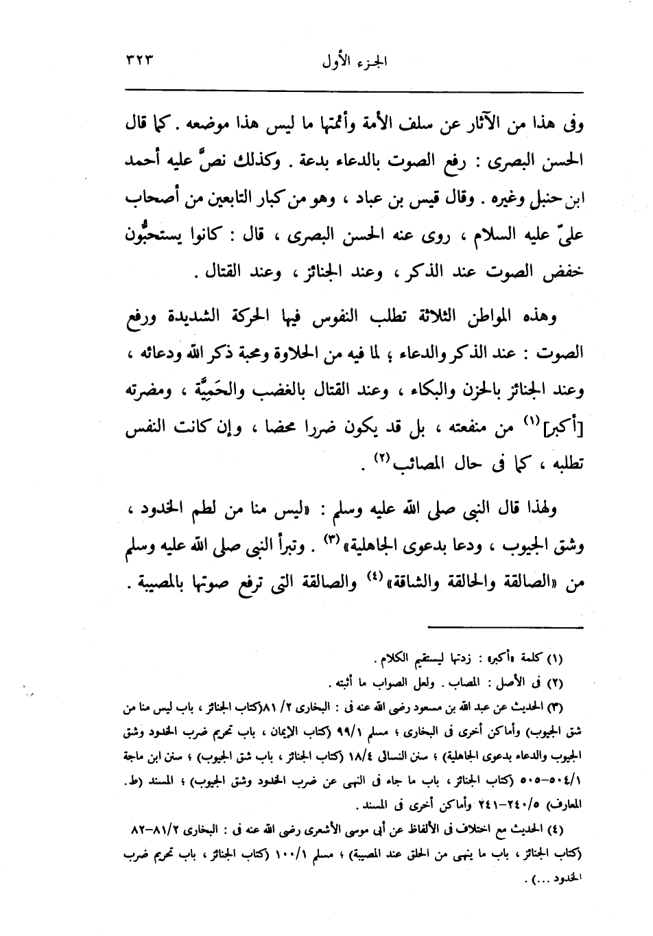 وَفِي هَذِه الْآثَار عَن سلف الْأمة وأئمتها مَا لَيْسَ هَذَا مَوْضِعه كَمَا قَالَ الْحسن الْبَصْرِيّ رفع الصَّوْت بِالدُّعَاءِ بِدعَة وَكَذَلِكَ نَص عَلَيْهِ أَحْمد ابْن حَنْبَل وَغَيره وَقَالَ قيس بن عباد وَهُوَ من كبار التَّابِعين من أَصْحَاب على عَلَيْهِ السَّلَام روى عَنهُ الْحسن الْبَصْرِيّ قَالَ كَانُوا يستحبون خفض الصَّوْت عِنْد الذّكر وَعند الْجَنَائِز وَعند الْقِتَال