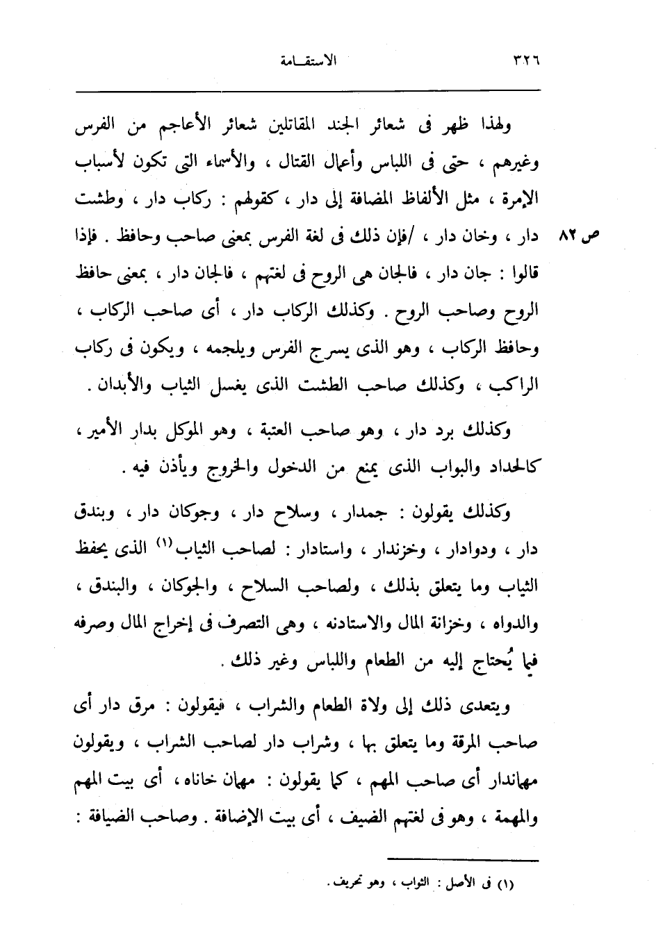 وَلِهَذَا ظهر فِي شَعَائِر الْجند المقاتلين شَعَائِر الْأَعَاجِم من الْفرس وَغَيرهم حَتَّى فِي اللبَاس وأعمال الْقِتَال والأسماء الَّتِي تكون لأسباب الإمرة مثل الْأَلْفَاظ المضافة إِلَى دَار كَقَوْلِهِم ركاب دَار وطشت دَار وخان دَار فَإِن ذَلِك فِي لُغَة الْفرس بِمَعْنى صَاحب وحافظ فَإِذا قَالُوا جَان دَار فالجان هِيَ الرّوح فِي لغتهم فالجان دَار بِمَعْنى حَافظ الرّوح وَصَاحب الرّوح وَكَذَلِكَ الركاب دَار أَي صَاحب الركاب وحافظ الركاب وَهُوَ الَّذِي يسرج الْفرس ويلجمه وَيكون فِي ركاب الرَّاكِب وَكَذَلِكَ صَاحب الطشت الَّذِي يغسل الثِّيَاب والأبدان