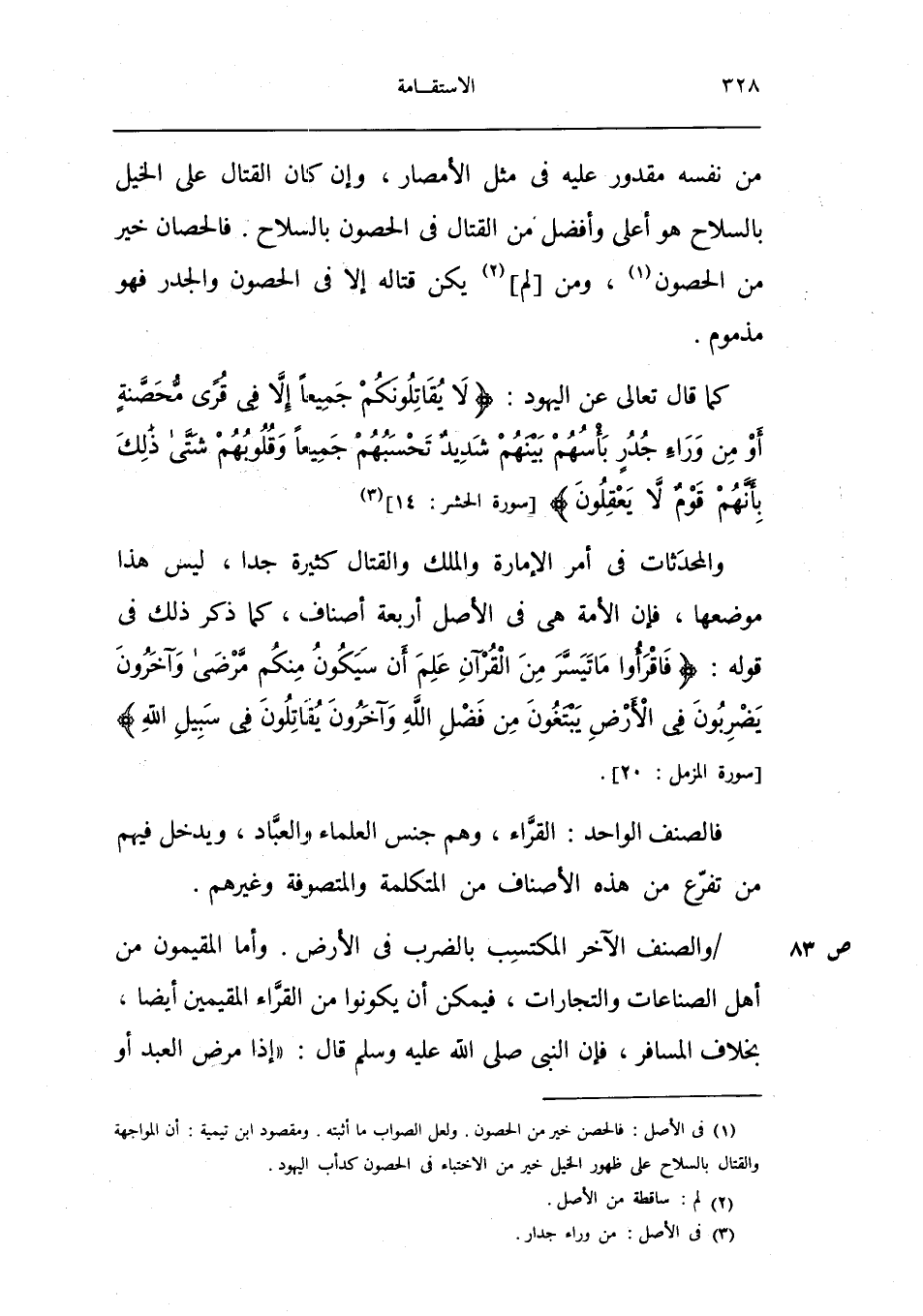 والمحدثات فِي أَمر الْإِمَارَة وَالْملك والقتال كَثِيرَة جدا لَيْسَ هَذَا موضعهَا فَإِن الْأمة هِيَ فِي الأَصْل اربعة أَصْنَاف كَمَا ذكر ذَلِك فِي قَوْله فاقرأوا مَا تيَسّر من الْقُرْآن علم أَن سَيكون مِنْكُم مرضى وَآخَرُونَ يضْربُونَ فِي الأَرْض يَبْتَغُونَ من فضل الله وَآخَرُونَ يُقَاتلُون فِي سَبِيل الله [سُورَة المزمل 20]