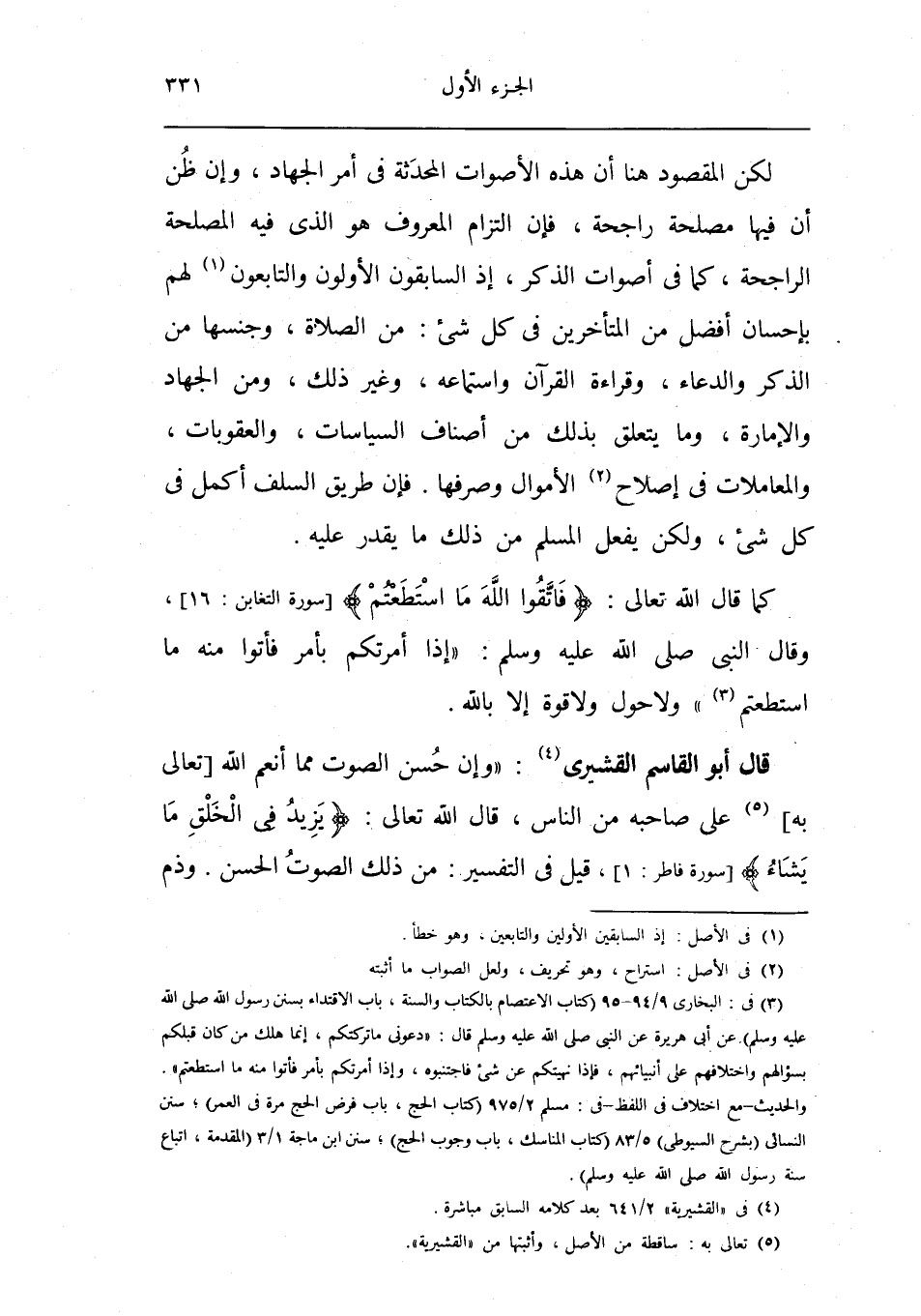 لَكِن الْمَقْصُود هُنَا ان هَذِه الْأَصْوَات المحدثة فِي امْر الْجِهَاد وَإِن ظن أَن فِيهَا مصلحَة راجحة فَإِن الْتِزَام الْمَعْرُوف هُوَ الَّذِي فِيهِ الْمصلحَة الراجحة كَمَا فِي اصوات الذّكر إِذْ السَّابِقُونَ الْأَولونَ والتابعون لَهُم بِإِحْسَان أفضل من الْمُتَأَخِّرين فِي كل شئ من الصَّلَاة وجنسها من الذّكر وَالدُّعَاء وَقِرَاءَة الْقُرْآن واستماعه وَغير ذَلِك وَمن الْجِهَاد والإمارة وَمَا يتَعَلَّق بذلك من أَصْنَاف السياسات والعقوبات والمعاملات فِي إصْلَاح الْأَمْوَال وصرفها فَإِن طَرِيق السّلف أكمل فِي كل شئ وَلَكِن يفعل الْمُسلم من ذَلِك مَا يقدر عَلَيْهِ