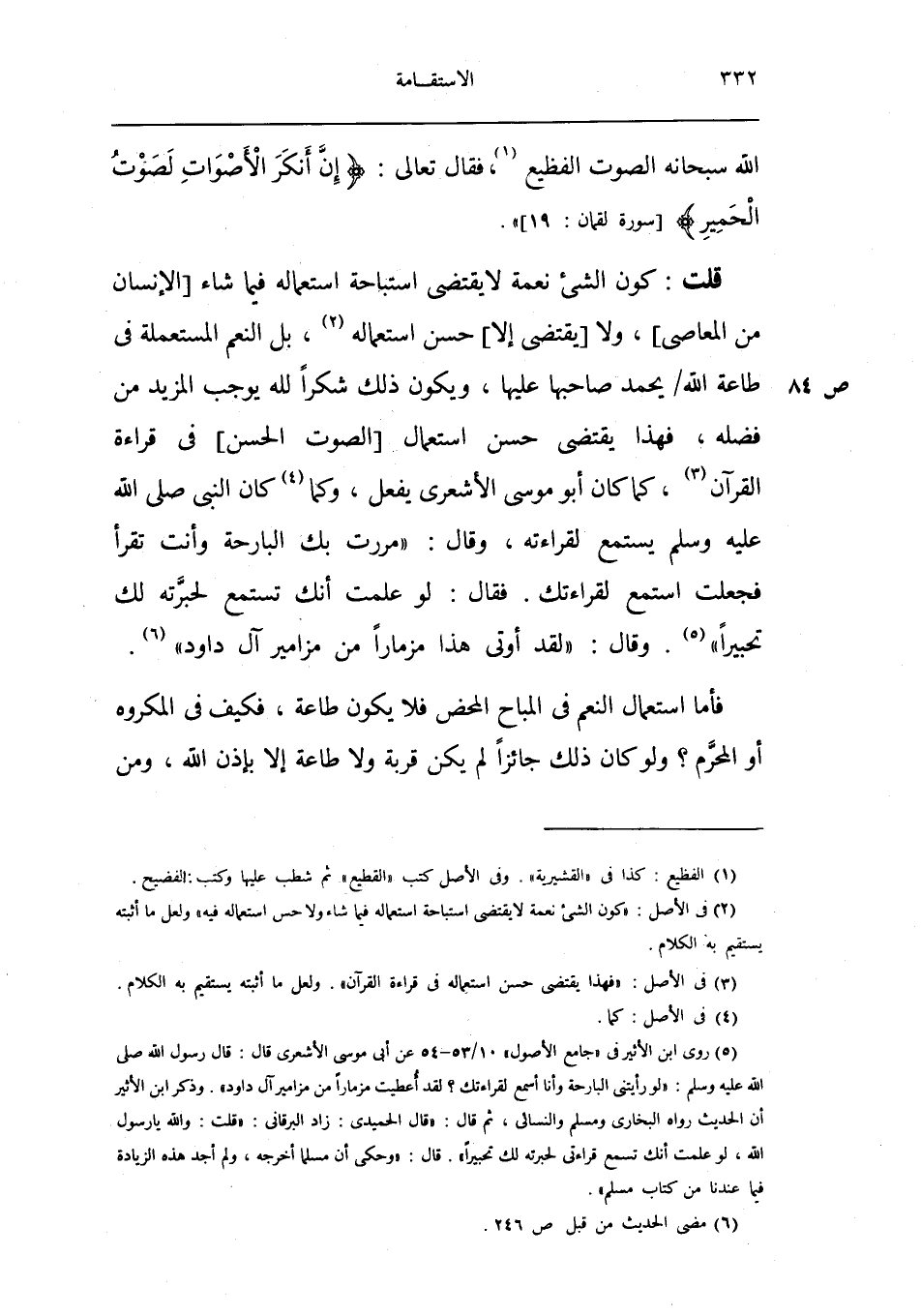 قلت كَون الشئ نعْمَة لَا يقتضى اسْتِبَاحَة اسْتِعْمَاله فِيمَا شَاءَ الْإِنْسَان من الْمعاصِي وَلَا يَقْتَضِي إِلَّا حسن اسْتِعْمَاله بل النعم المستعملة فِي طَاعَة الله يحمد صَاحبهَا عَلَيْهَا وَيكون ذَلِك شكرا لله يُوجب الْمَزِيد من فَضله فَهَذَا يَقْتَضِي حسن اسْتِعْمَال الصَّوْت الْحسن فِي قِرَاءَة الْقُرْآن كَمَا كَانَ أَبُو مُوسَى الْأَشْعَرِيّ يفعل وكما كَانَ النَّبِي صلى الله عَلَيْهِ وَسلم يستمع لقرَاءَته وَقَالَ مَرَرْت بك البارحة وَأَنت تقْرَأ فَجعلت اسْتمع لقراءتك فَقَالَ لَو علمت أَنَّك تستمع لحبرته لَك تحبيرا وَقَالَ لقد أُوتى هَذَا مِزْمَارًا من مَزَامِير آل دَاوُد