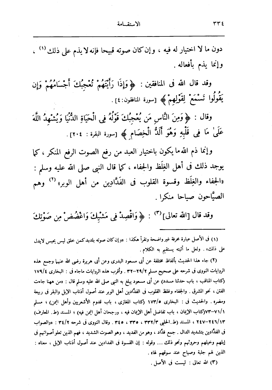 وَإِنَّمَا ذمّ الله مَا يكون بآختيار العَبْد من رفع الصَّوْت الرّفْع الْمُنكر كَمَا يُوجد ذَلِك فِي أهل الغلظ والجفاء كَمَا قَالَ النَّبِي صلى الله عَلَيْهِ وَسلم الْجفَاء والغلط وقسوة الْقُلُوب فِي الْفَدادِين من أهل الْوَبر وهم الصياحون صياحا مُنْكرا