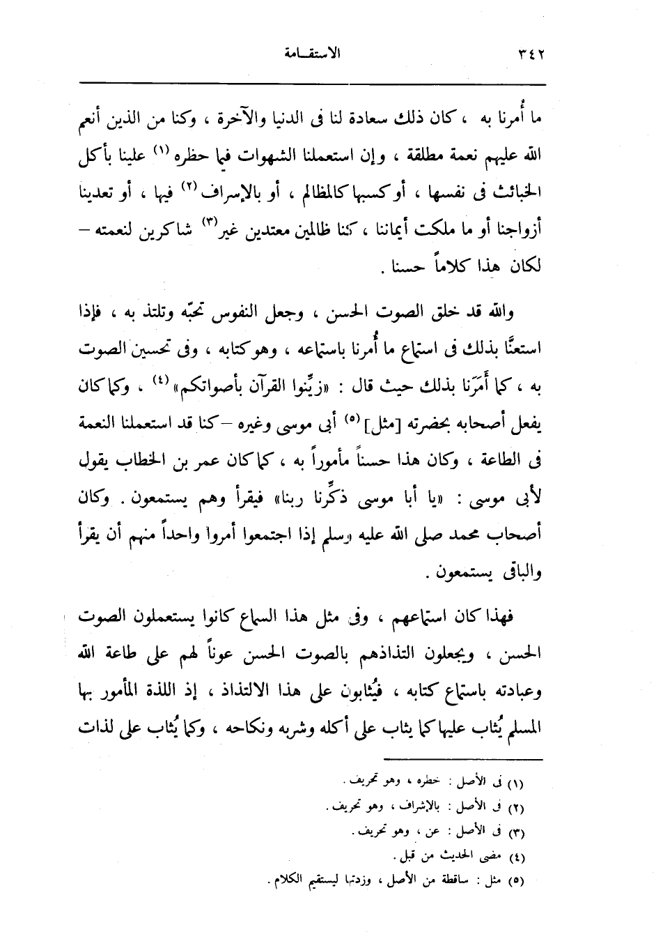 وَالله قد خلق الصَّوْت الْحسن وَجعل النُّفُوس تحبه وتلتذ بِهِ فَإِذا استعنا بذلك فِي اسْتِمَاع مَا امرنا باستماعه وَهُوَ كِتَابه وَفِي تَحْسِين الصَّوْت بِهِ كَمَا أمرنَا بذلك حَيْثُ قَالَ زَينُوا الْقُرْآن باصواتكم وكما كَانَ يفعل أَصْحَابه بِحَضْرَتِهِ مثل أبي مُوسَى وَغَيره كُنَّا قد استعملنا النِّعْمَة فِي الطَّاعَة وَكَانَ هَذَا حسنا مَأْمُورا بِهِ كَمَا كَانَ عمر بن الْخطاب يَقُول لأبي مُوسَى يَا أَبَا مُوسَى ذكرنَا رَبنَا فَيقْرَأ وهم يَسْتَمِعُون وَكَانَ أَصْحَاب مُحَمَّد ص إِذا اجْتَمعُوا أمروا وَاحِدًا مِنْهُم أَن يقْرَأ وَالْبَاقِي يَسْتَمِعُون