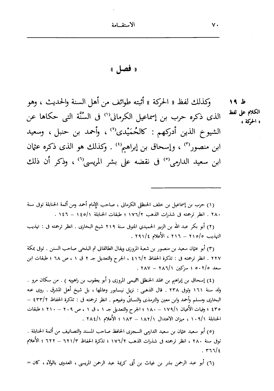 حَرْب بن اسماعيل الْكرْمَانِي فِي السّنة الَّتِي حَكَاهَا عَن الشُّيُوخ الَّذين أدركهم كالحميدي وَأحمد بن حَنْبَل وَسَعِيد ابْن مَنْصُور وَإِسْحَاق بن إِبْرَاهِيم وَكَذَلِكَ هُوَ الَّذِي ذكره عُثْمَان ابْن سعيد الدارمى فِي نقضه على بشر المريسى وَذكر أَن ذَلِك