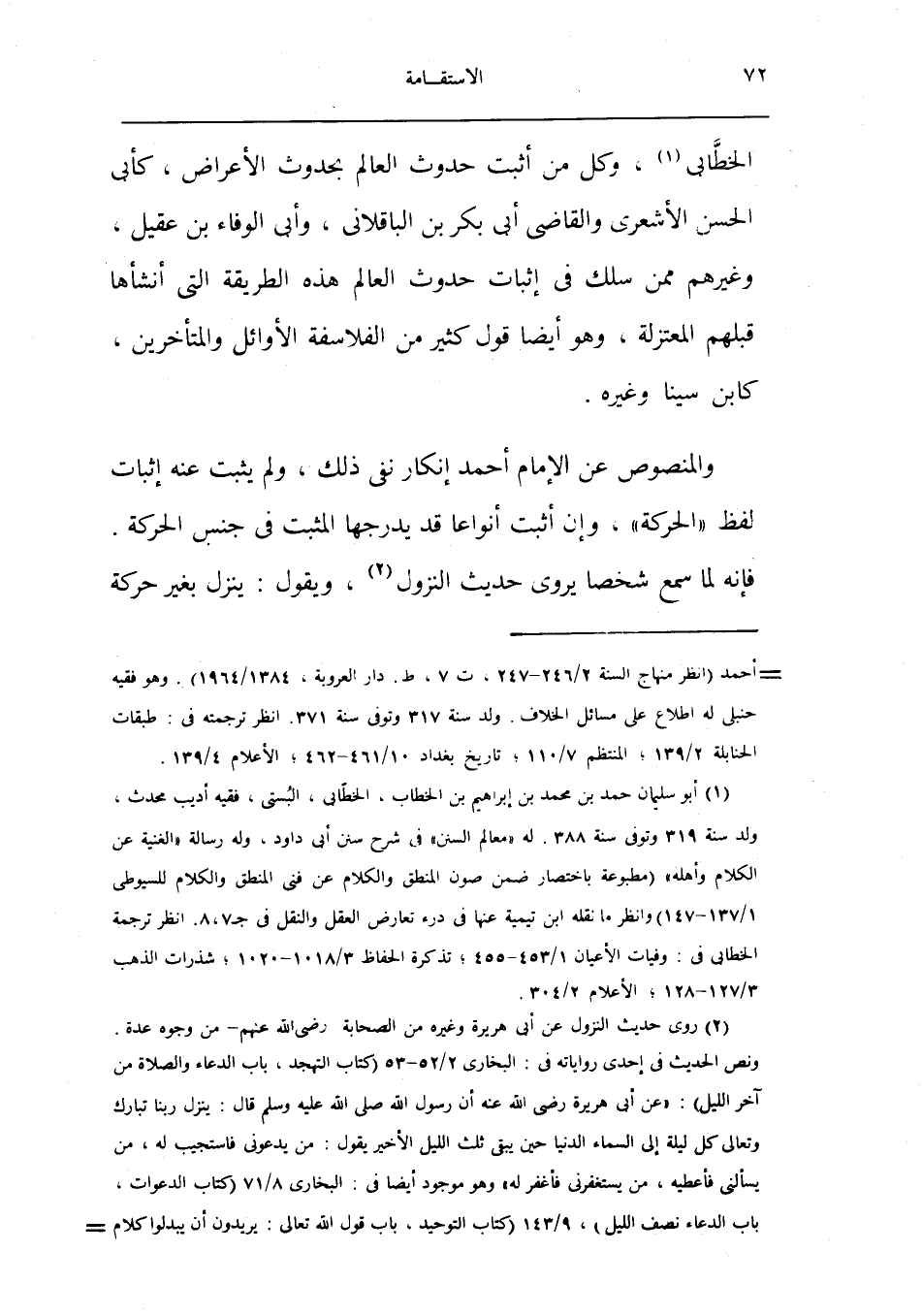 وَالْمَنْصُوص عَن الإِمَام أَحْمد إِنْكَار نفي ذَلِك وَلم يثبت عَنهُ إِثْبَات لفظ الْحَرَكَة وَإِن أثبت أنواعا قد يدرجها الْمُثبت فِي جنس الْحَرَكَة فَإِنَّهُ لما سمع شخصا يرْوى حَدِيث النُّزُول وَيَقُول ينزل بِغَيْر حَرَكَة