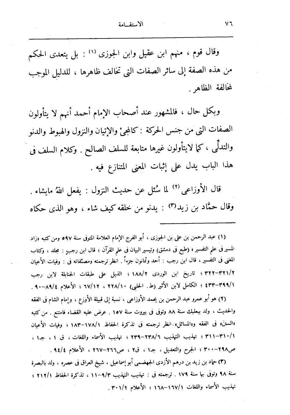 قَالَ الأوزاعى لما سُئِلَ عَن حَدِيث النُّزُول يفعل الله مايشاء وَقَالَ حَمَّاد بن زيد يدنو من خلقه كَيفَ شَاءَ وَهُوَ الَّذِي حَكَاهُ