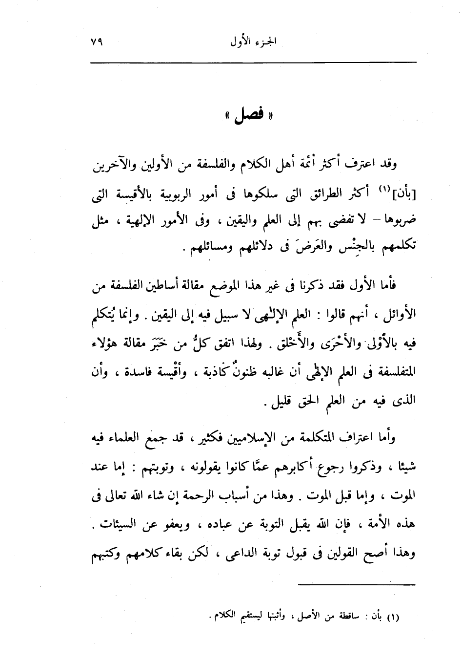 فصل وَقد اعْترف أَكثر أَئِمَّة أهل الْكَلَام والفلسفة من الْأَوَّلين والآخرين بِأَن