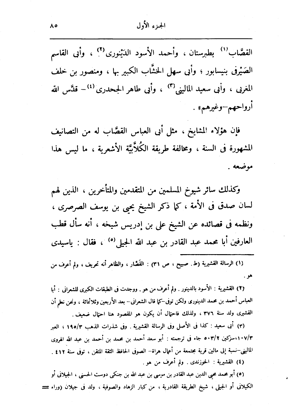 فَإِن هَؤُلَاءِ الْمَشَايِخ مثل أَبى الْعَبَّاس القصاب لَهُ من التصانيف الْمَشْهُورَة فِي السّنة وَمُخَالفَة طَريقَة الْكلابِيَّة الأشعرية مَا لَيْسَ هَذَا مَوْضِعه