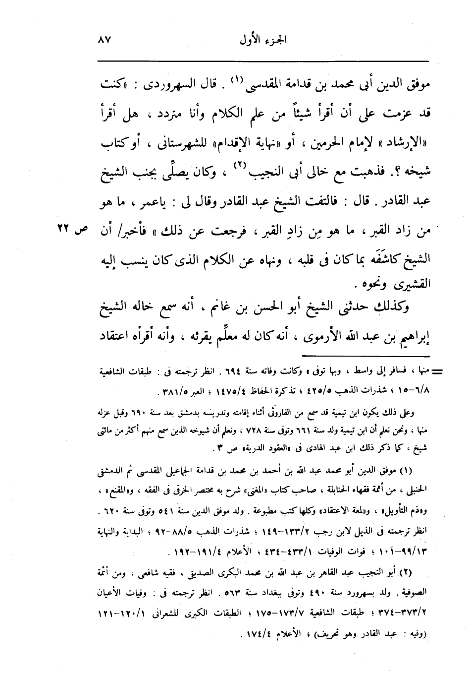 موفق الدّين أبي مُحَمَّد بن قدامَة المقدسى قَالَ السهروردى كنت عزمت على أَن أَقرَأ شَيْئا من علم الْكَلَام وَأَنا مُتَرَدّد هَل أَقرَأ الْإِرْشَاد لإِمَام الْحَرَمَيْنِ أَو نِهَايَة الْإِقْدَام للشهرستاني أَو كتاب شَيْخه فَذَهَبت مَعَ خَالِي أبي النجيب وَكَانَ يصلى بِجنب الشَّيْخ عبد الْقَادِر قَالَ فَالْتَفت الشَّيْخ عبد الْقَادِر وَقَالَ لي يَا عمر مَا هُوَ من زَاد الْقَبْر مَا هُوَ من زَاد الْقَبْر فَرَجَعت عَن ذَلِك فَأخْبر أَن الشَّيْخ كاشفه بِمَا كَانَ فِي قلبه وَنَهَاهُ عَن الْكَلَام الَّذِي كَانَ ينْسب إِلَيْهِ القشيرى وَنَحْوه