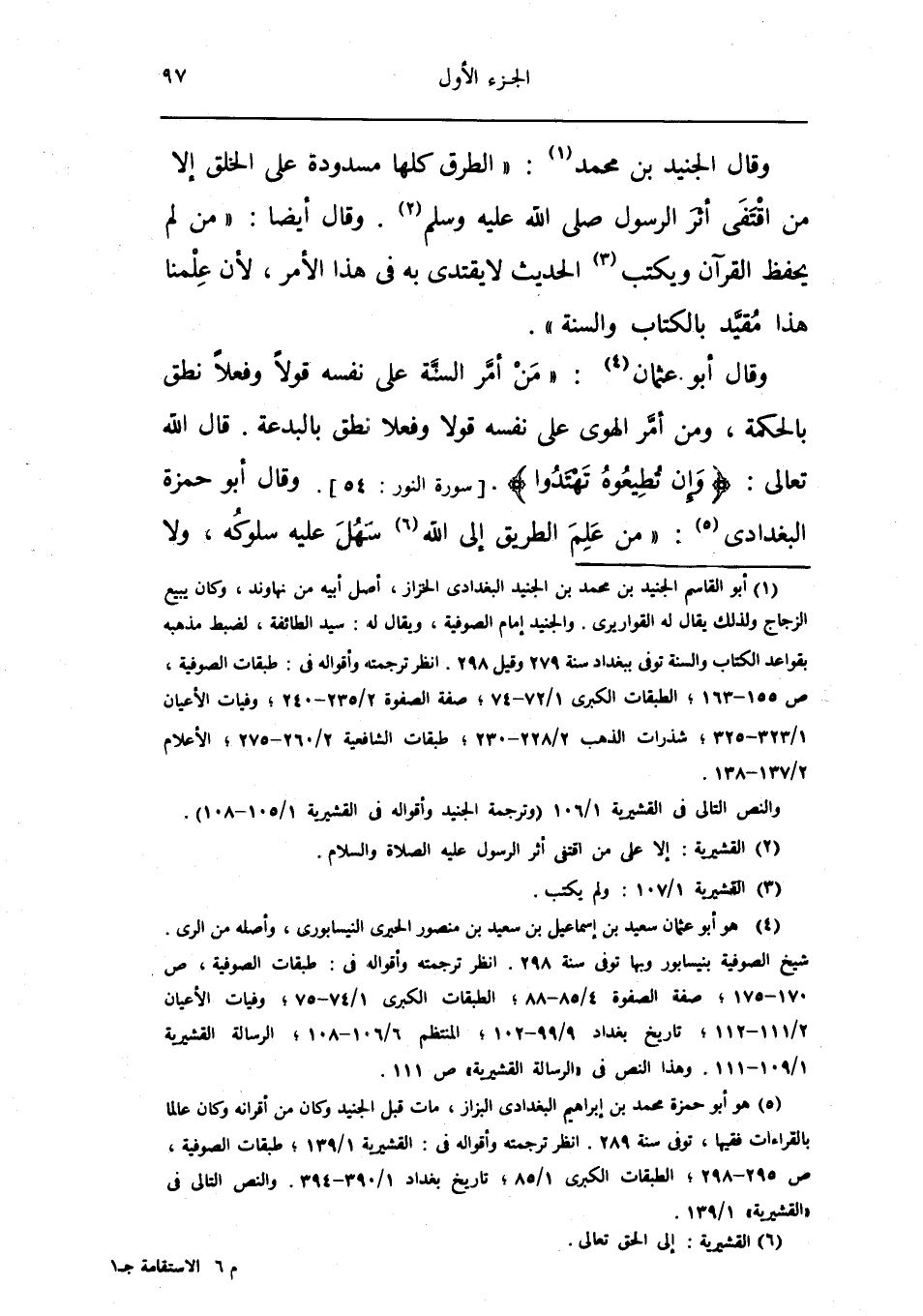 وَقَالَ الْجُنَيْد بن مُحَمَّد الطّرق كلهَا مسدودة على الْخلق إِلَّا من اقتفى أثر الرَّسُول صلى الله عَلَيْهِ وَسلم وَقَالَ ايضا من لم يحفظ الْقُرْآن وَيكْتب الحَدِيث لَا يقْتَدى بِهِ فِي هَذَا الْأَمر لِأَن علمنَا هَذَا مُقَيّد بِالْكتاب وَالسّنة