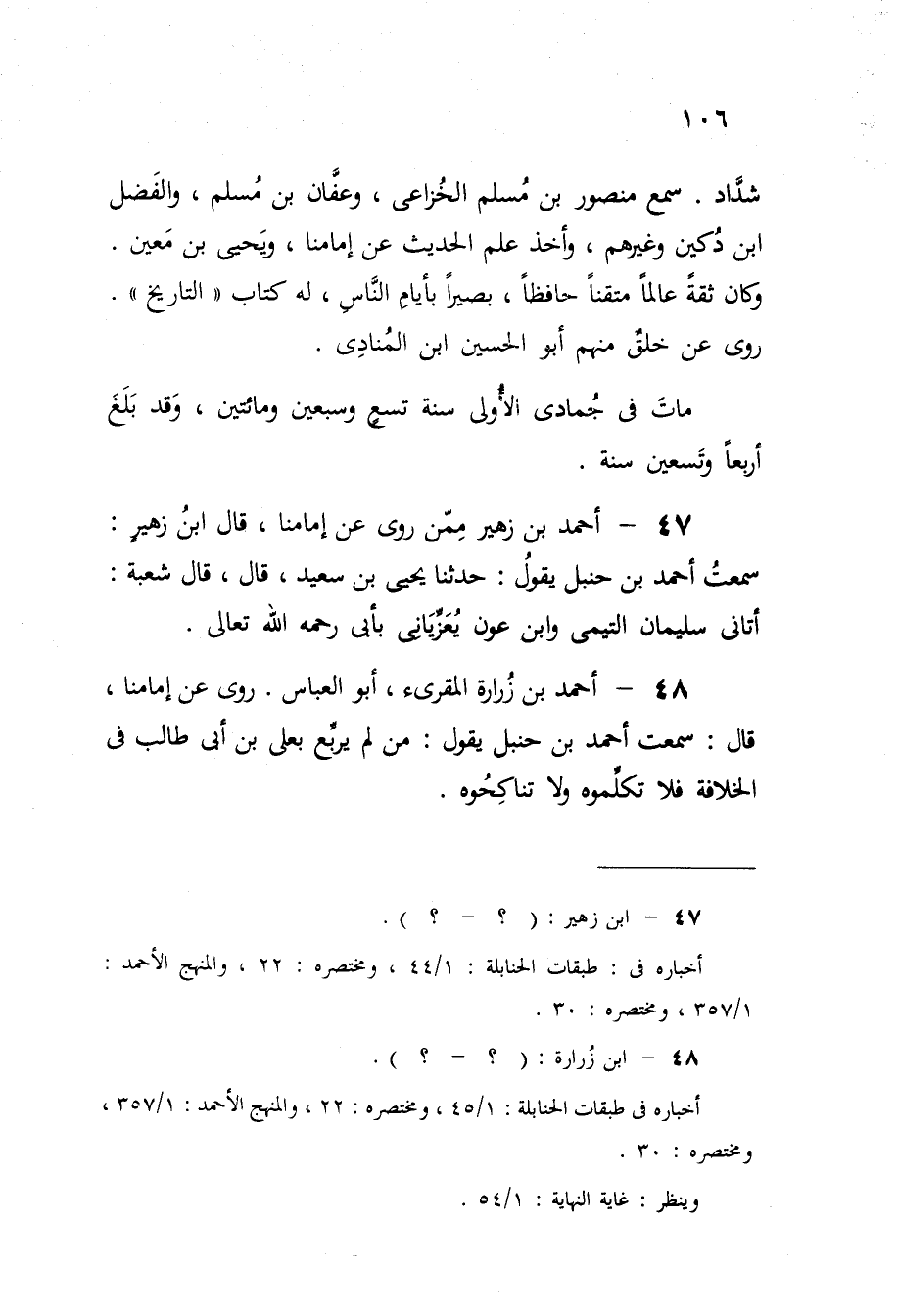 47 - أَحْمد بن زُهَيْر مِمَّن روى عَن إمامنا قَالَ ابْن زُهَيْر سَمِعت أَحْمد بن حَنْبَل يَقُول حَدثنَا يحيى بن سعيد قَالَ قَالَ شُعْبَة أتانى سُلَيْمَان التيمى وَابْن عون يعزيانى بأبى رَحمَه الله تَعَالَى