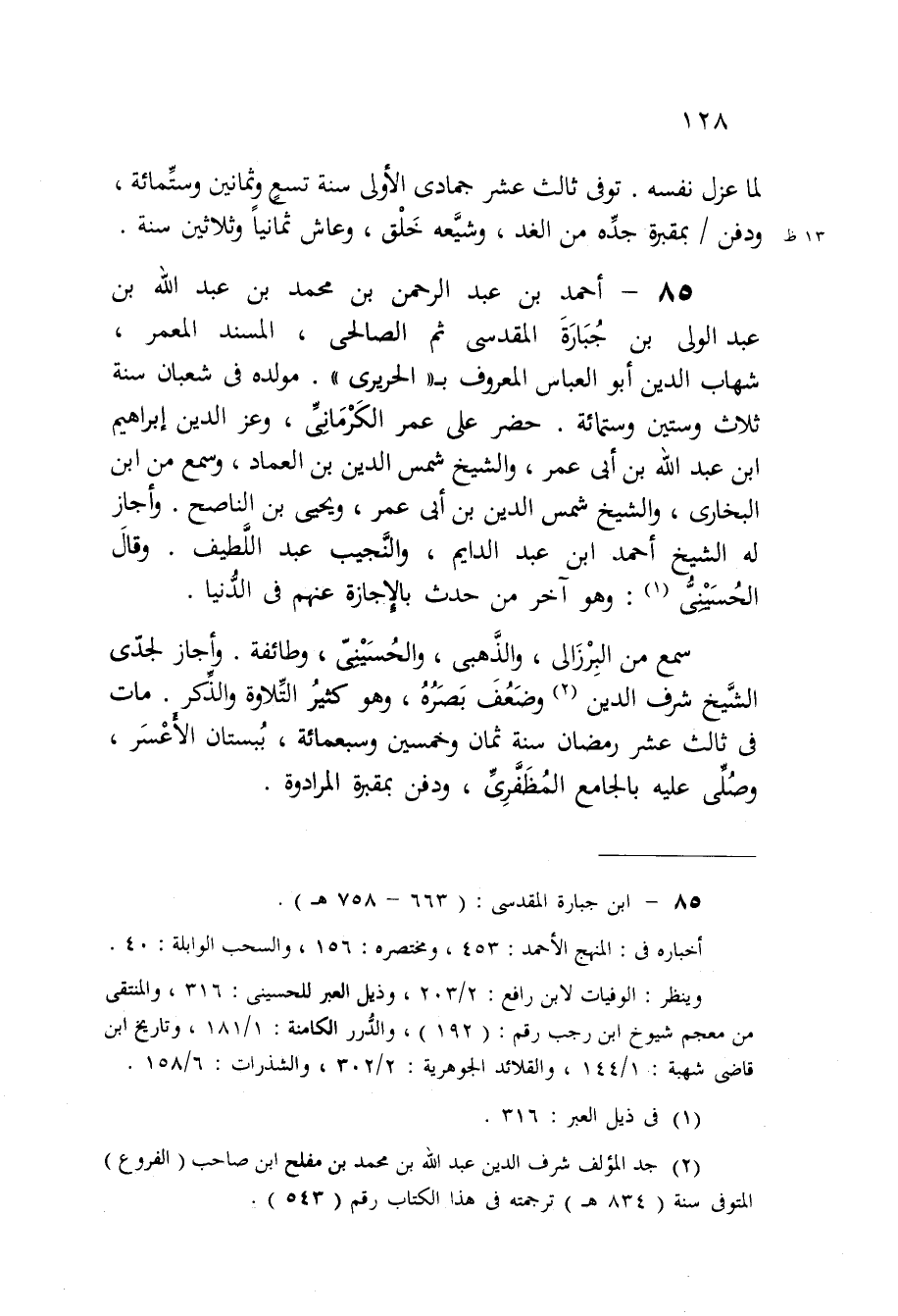 85 - أَحْمد بن عبد الرَّحْمَن بن مُحَمَّد بن عبد الله بن عبد الولى بن جبارَة المقدسى ثمَّ الصالحى الْمسند المعمر شهَاب الدّين أَبُو الْعَبَّاس الْمَعْرُوف ب الحريرى