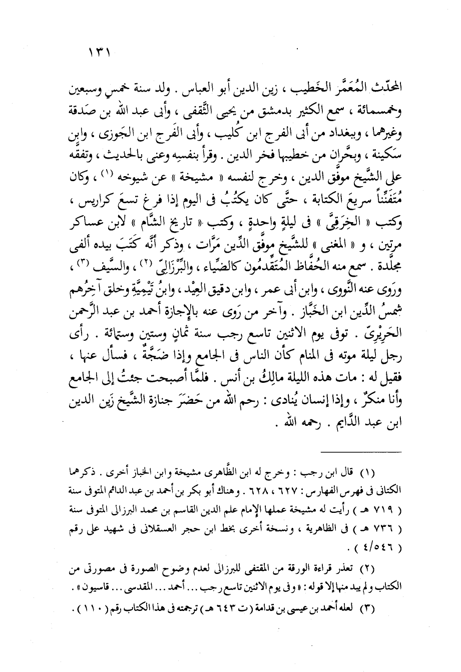 وَقَرَأَ بِنَفسِهِ وعنى بِالْحَدِيثِ وتفقه على الشَّيْخ موفق الدّين وَخرج لنَفسِهِ مشيخة عَن شُيُوخه وَكَانَ متفننا سريع الْكِتَابَة حَتَّى كَانَ يكْتب فى الْيَوْم إِذا فرغ تسع كراريس وَكتب الخرقى فى لَيْلَة وَاحِدَة وَكتب تَارِيخ الشَّام لِابْنِ عَسَاكِر مرَّتَيْنِ والمغنى للشَّيْخ موفق الدّين مَرَّات وَذكر أَنه كتب بِيَدِهِ ألفى مجلدة