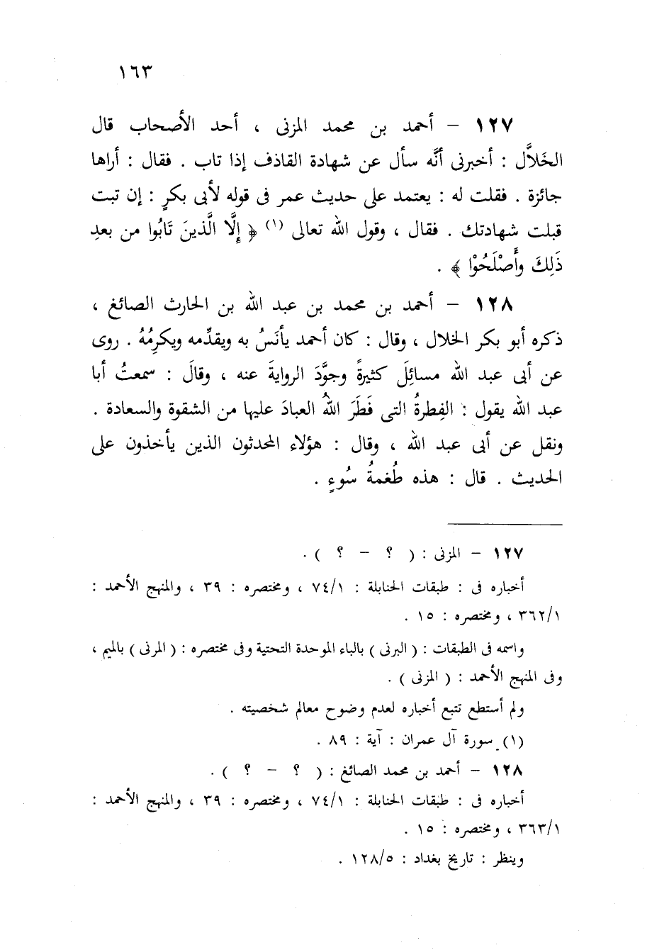 127 - أَحْمد بن مُحَمَّد المزنى أحد الْأَصْحَاب قَالَ الْخلال أَخْبرنِي أَنه سَأَلَ عَن شَهَادَة الْقَاذِف إِذا تَابَ