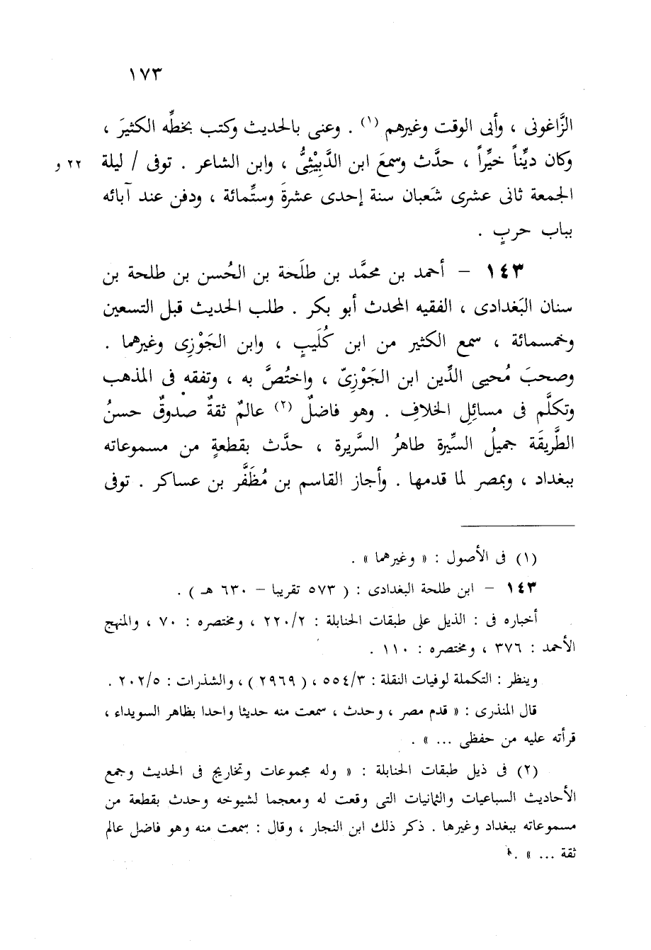 143 - أَحْمد بن مُحَمَّد بن طلحلة بن الْحسن بن طلحلة بن سِنَان البغدادى الْفَقِيه الْمُحدث أَبُو بكر