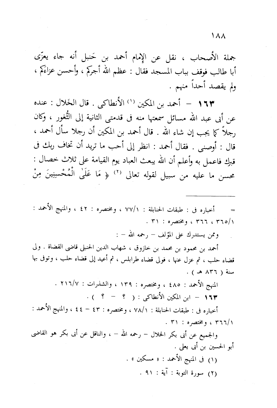 جملَة الْأَصْحَاب نقل عَن الإِمَام أَحْمد بن حَنْبَل أَنه جَاءَ يعزى أَبَا طَالب فَوقف بِبَاب الْمَسْجِد فَقَالَ عظم الله أجركُم وَأحسن عزاءكم وَلم يقْصد أحدا مِنْهُم