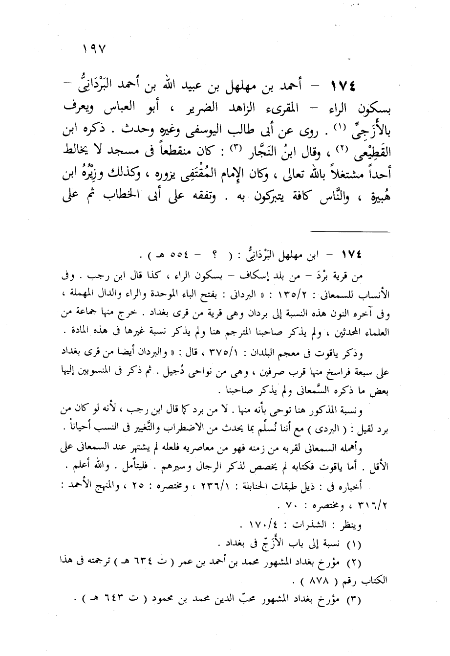 174 - أَحْمد بن مهلهل بن عبيد الله بن أَحْمد البردانى بِسُكُون الرَّاء المقرىء الزَّاهِد الضَّرِير أَبُو الْعَبَّاس وَيعرف بالأزجى