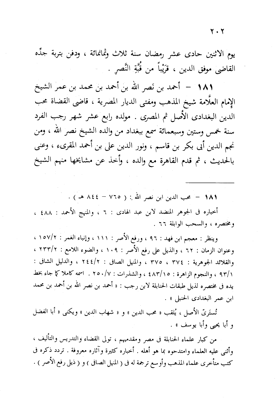 181 - أَحْمد بن نصر الله بن أَحْمد بن مُحَمَّد بن عمر الشَّيْخ الإِمَام الْعَلامَة شيخ الْمَذْهَب ومفتى الديار المصرية قاضى الْقُضَاة محب الدّين البغدادى الأَصْل ثمَّ المصرى