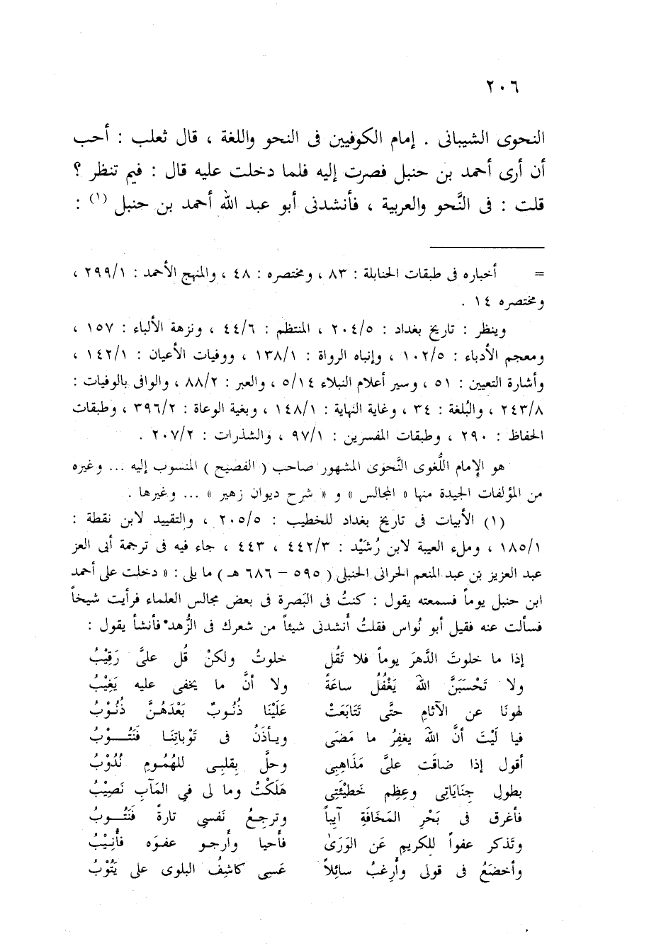 إِمَام الْكُوفِيّين فى النَّحْو واللغة قَالَ ثَعْلَب أحب أَن أرى أَحْمد بن حَنْبَل فصرت إِلَيْهِ فَلَمَّا دخلت عَلَيْهِ قَالَ فيمَ تنظر قلت فى النَّحْو والعربية فأنشدنى أَبُو عبد الله أَحْمد بن حَنْبَل