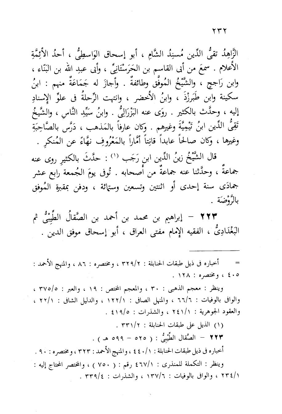 223 - إِبْرَاهِيم بن مُحَمَّد بن أَحْمد بن الصقال الطيبى ثمَّ البغدادى الْفَقِيه الإِمَام مفتى الْعرَاق أَبُو إِسْحَاق موفق الدّين