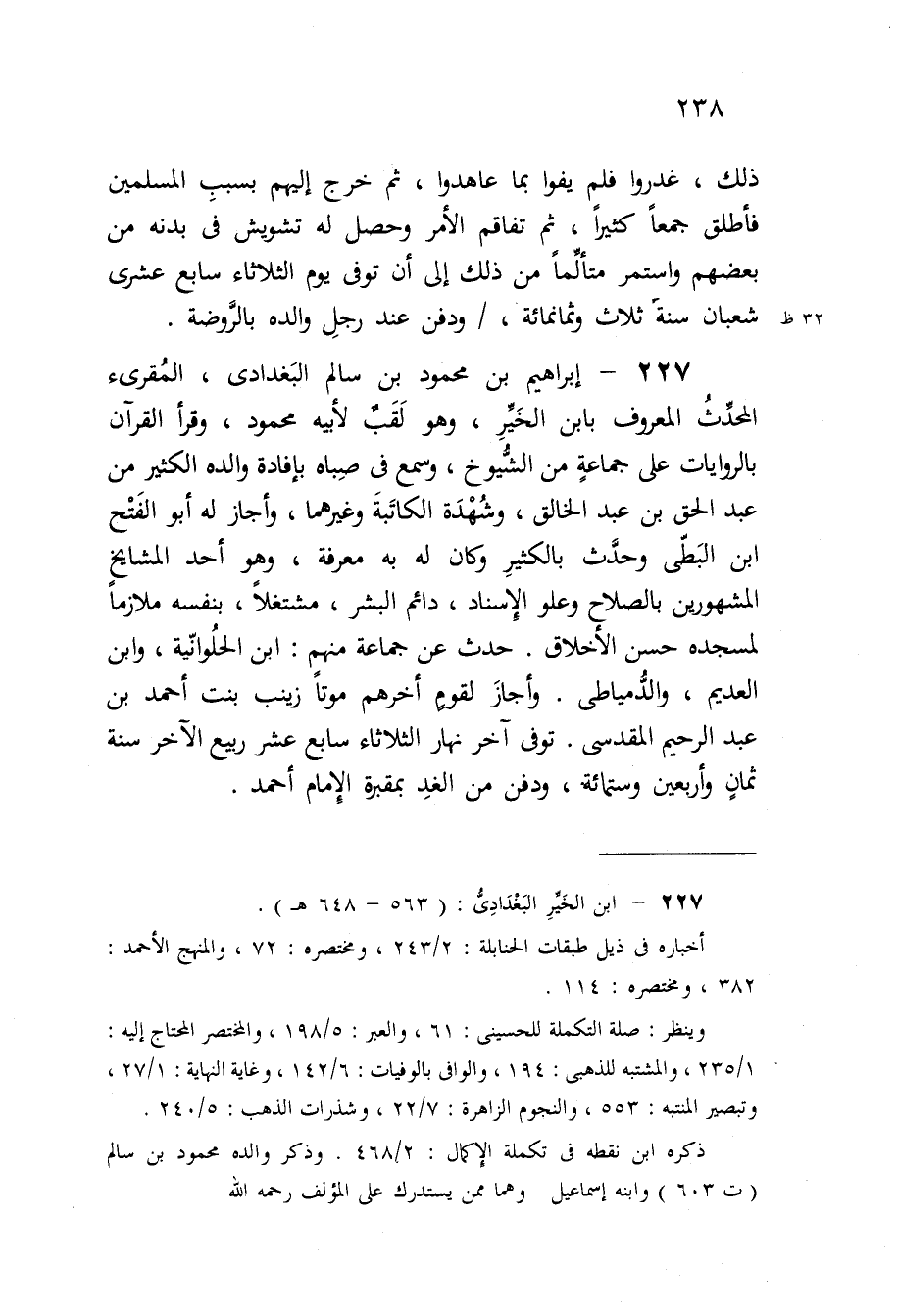 227 - إِبْرَاهِيم بن مَحْمُود بن سَالم البغدادى المقرىء الْمُحدث الْمَعْرُوف بِابْن الْخَيْر وَهُوَ لقب لِأَبِيهِ مَحْمُود وَقَرَأَ الْقُرْآن بالروايات على جمَاعَة من الشُّيُوخ وَسمع فى صباه بإفادة وَالِده الْكثير من عبد الْحق بن عبد الْخَالِق وشهدة الكاتبة وَغَيرهمَا وَأَجَازَ لَهُ أَبُو الْفَتْح ابْن البطى وَحدث بالكثير وَكَانَ لَهُ بِهِ معرفَة وَهُوَ أحد الْمَشَايِخ الْمَشْهُورين بالصلاح وعلو الْإِسْنَاد دَائِم الْبشر مشتغلا بِنَفسِهِ ملازما لمسجده حسن الْأَخْلَاق
