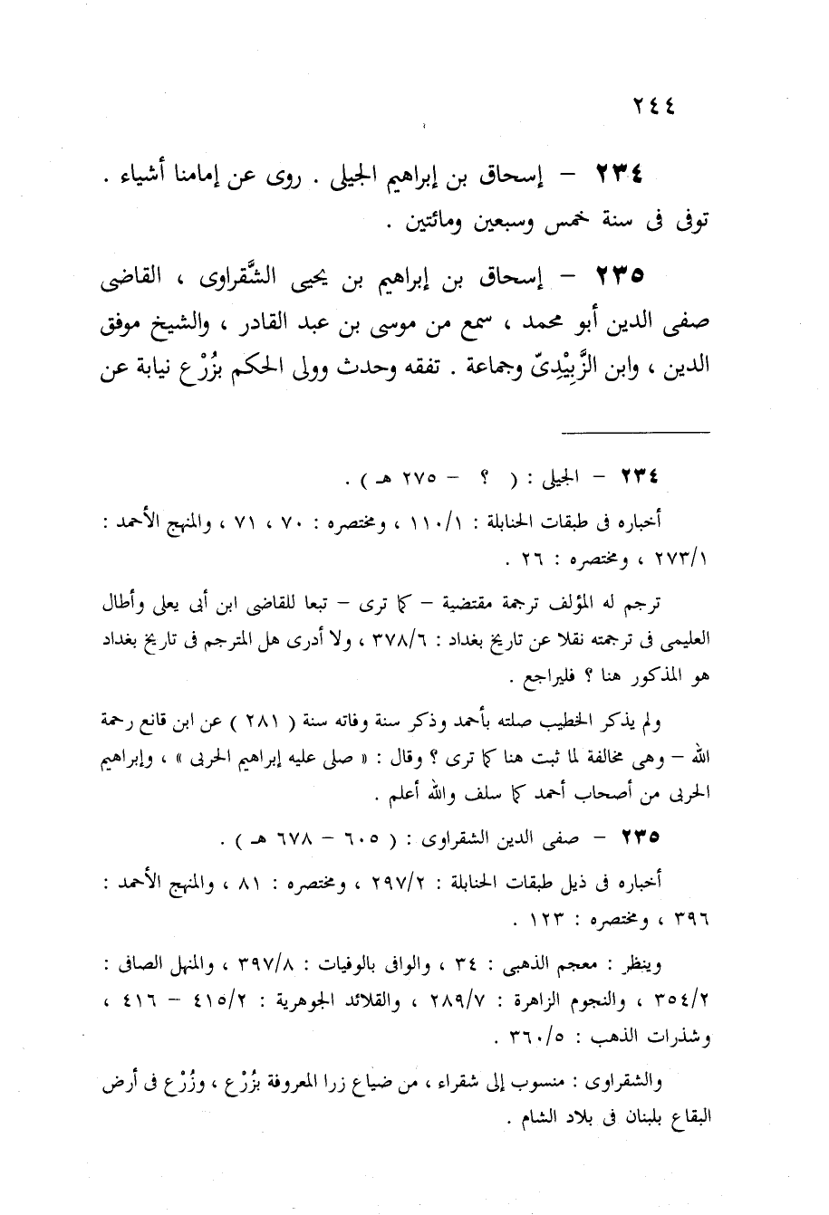 235 - إِسْحَاق بن إِبْرَاهِيم بن يحيى الشقراوى القاضى صفى الدّين أَبُو مُحَمَّد سمع من مُوسَى بن عبد الْقَادِر وَالشَّيْخ موفق الدّين وَابْن الزبيدى وَجَمَاعَة