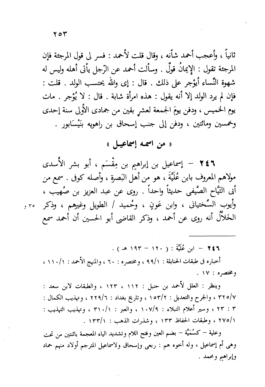 246 - إِسْمَاعِيل بن إِبْرَاهِيم بن مقسم أَبُو بشر الأسدى مَوْلَاهُم الْمَعْرُوف بِابْن علية هُوَ من أهل الْبَصْرَة وَأَصله كوفى