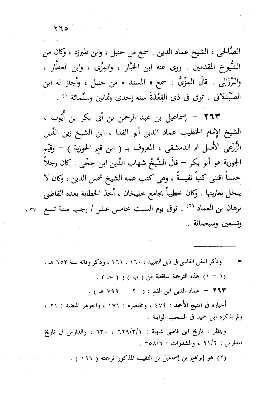 263 - إِسْمَاعِيل بن عبد الرَّحْمَن بن أَبى بكر بن أَيُّوب الشَّيْخ الإِمَام الْخَطِيب عماد الدّين أَبُو الفدا ابْن الشَّيْخ زين الدّين الزرعى الأَصْل ثمَّ الدمشقى الْمَعْرُوف ب ابْن قيم الجوزية وقيم الجوزية هُوَ أَبُو بكر قَالَ الشَّيْخ شهَاب الدّين ابْن حجى كَانَ رجلا حسنا اقتنى كتبا نفيسة وَهِي كتب عَمه الشَّيْخ شمس الدّين وَكَانَ لَا يبخل بعاريتها